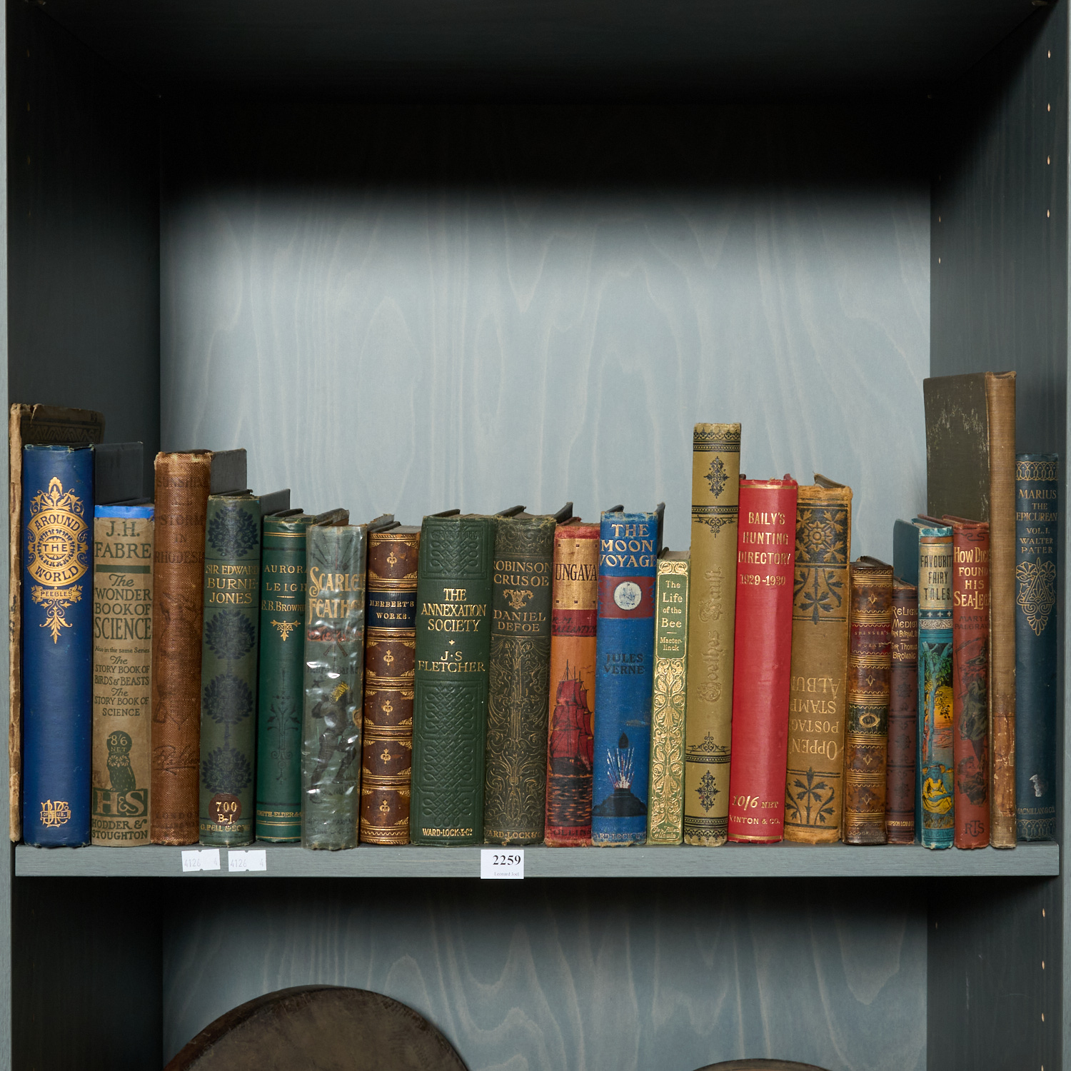 A SHELF OF ANTIQUE AND VINTAGE BINDINGS INCLUDING GOETHE, JULES VERNE, PEEBLES 'AROUND THE WORLD', AND SELORS 'SUNSHINE AND STORM IN RHODESIA'