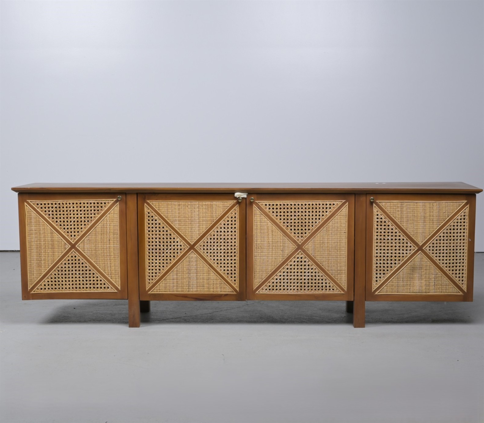 A TEAK AND RATTAN SIDEBOARD (66CM H X 214CM W X 44CM D) (THIS ITEM MUST BE REMOVED BY PROFESSIONAL CARRIERS OR CLIENTS. LEONARD JOEL STAFF CANNOT ASSIST WITH CARRYING OR DELIVERY OF THIS ITEM)