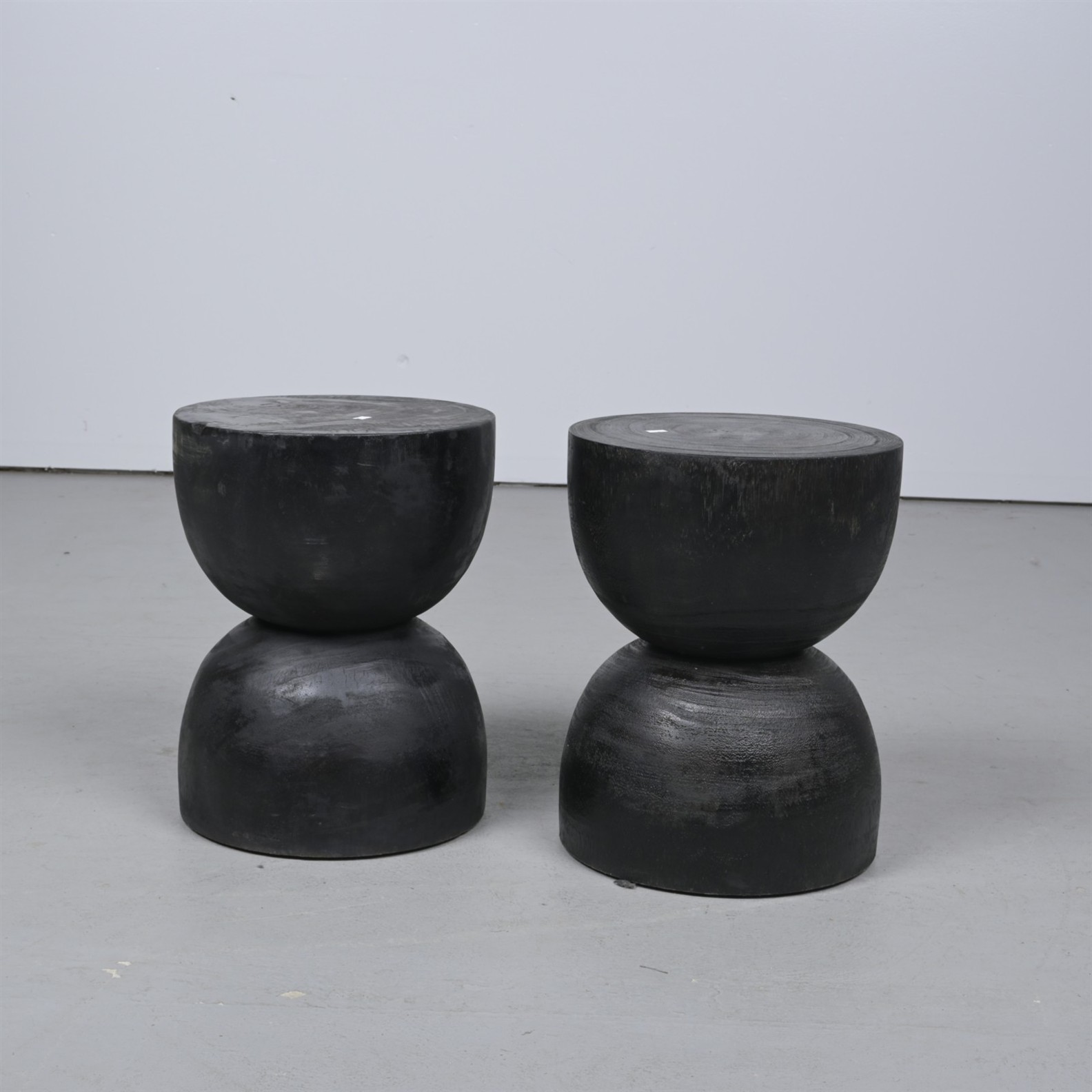 A PAIR OF STAINED HARDWOOD SIDE TABLES (46CM H X 35CM DIA)