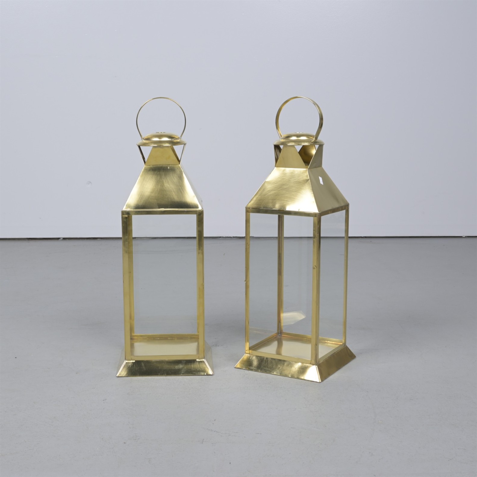 A PAIR OF BRASS LANTERNS (73CM H X 25CM W X 25CM D)
