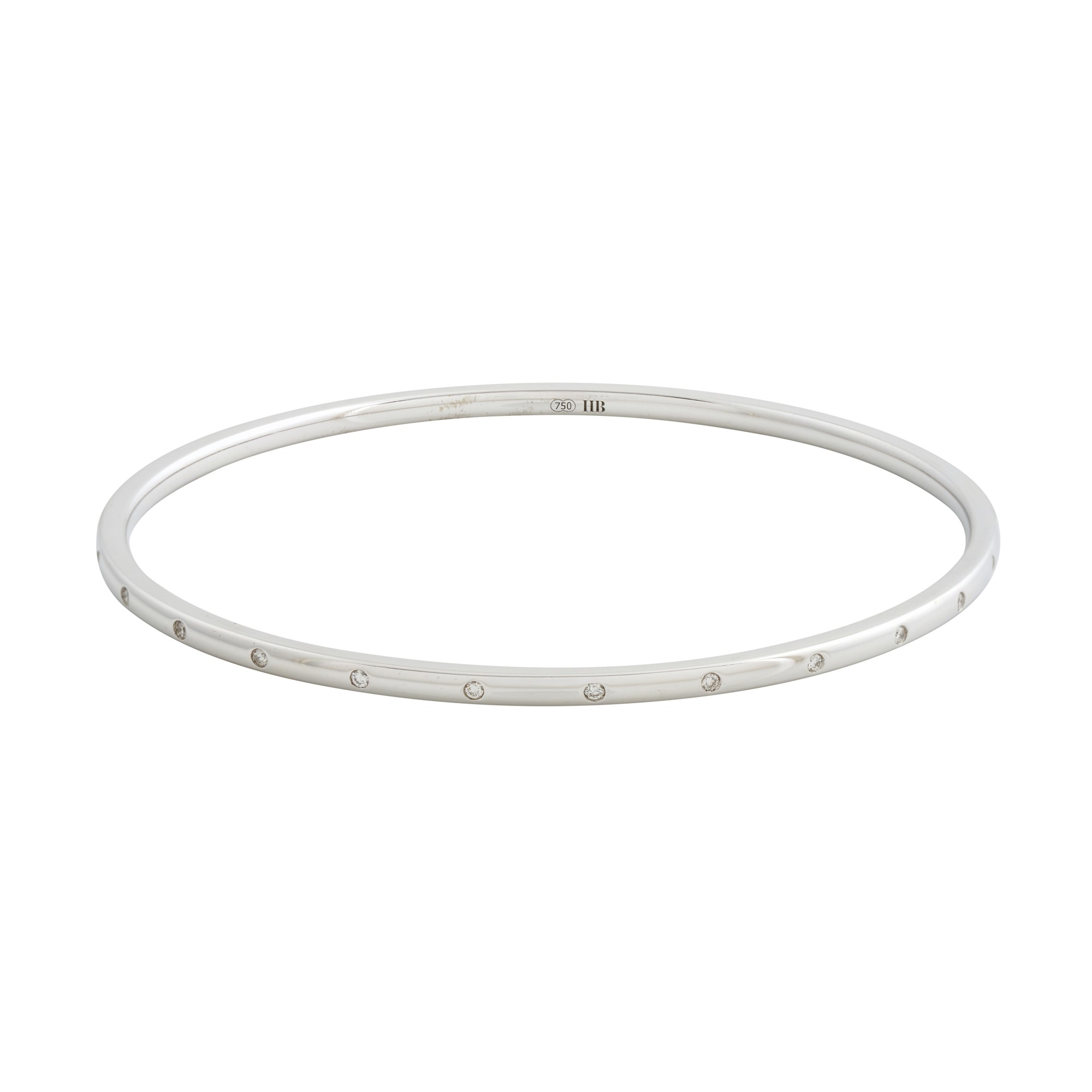 Comprising twenty-five round brilliant-cut diamonds at spaced intervals, the diamonds together weighing approximately 0.010 carats, internal diameter approximately 165mm, approximate width 26mm, gross weight approximately18.3 grams.