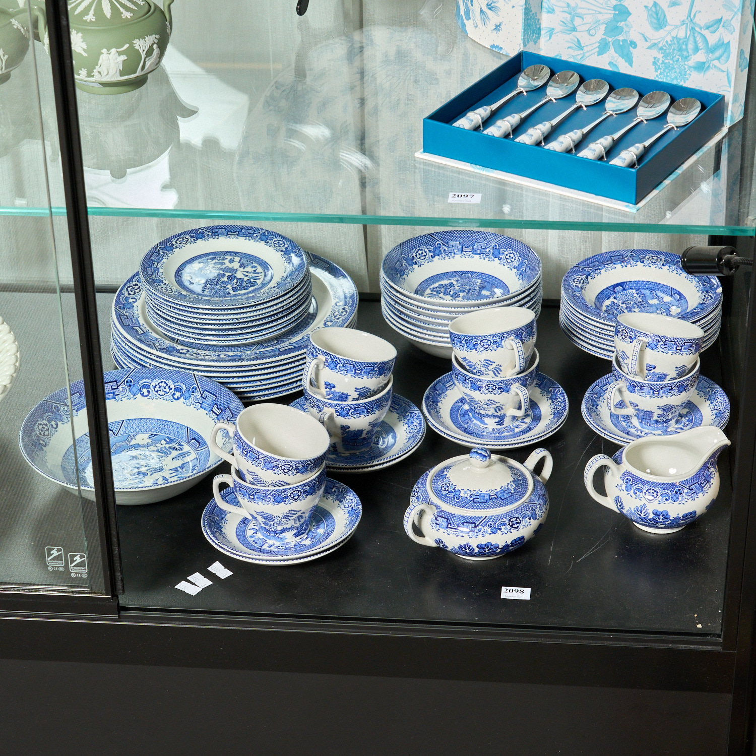 A WOODSWARE WILLOW PATTERN DINNER SERVICE FOR EIGHT (TWO ITEMS A/F) DIA.24.5CM (LARGEST)