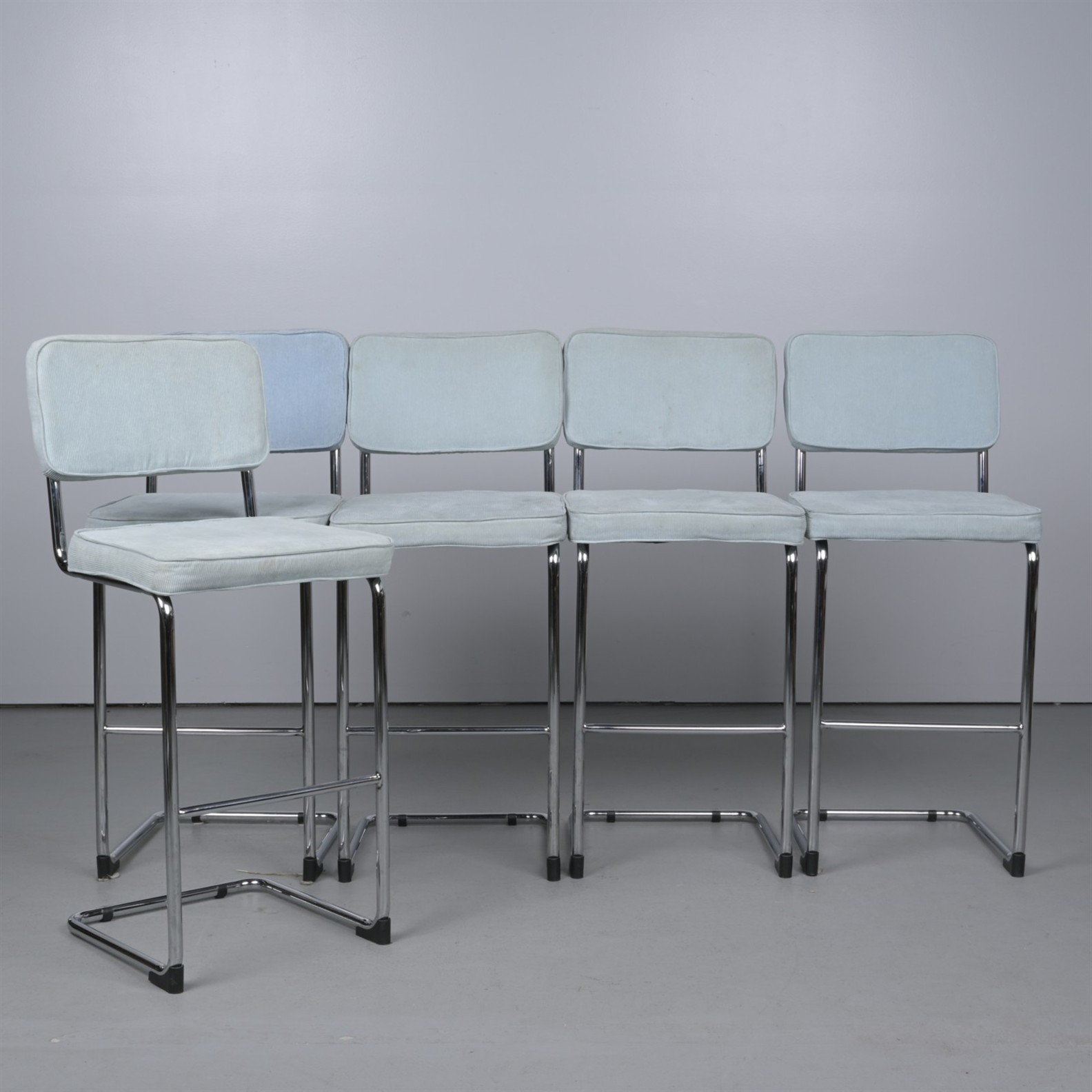 A GROUP OF FIVE CHROME AND UPHOLSTERED BARSTOOLS (A/F) (114CM H X 49CM W X 48CM D)