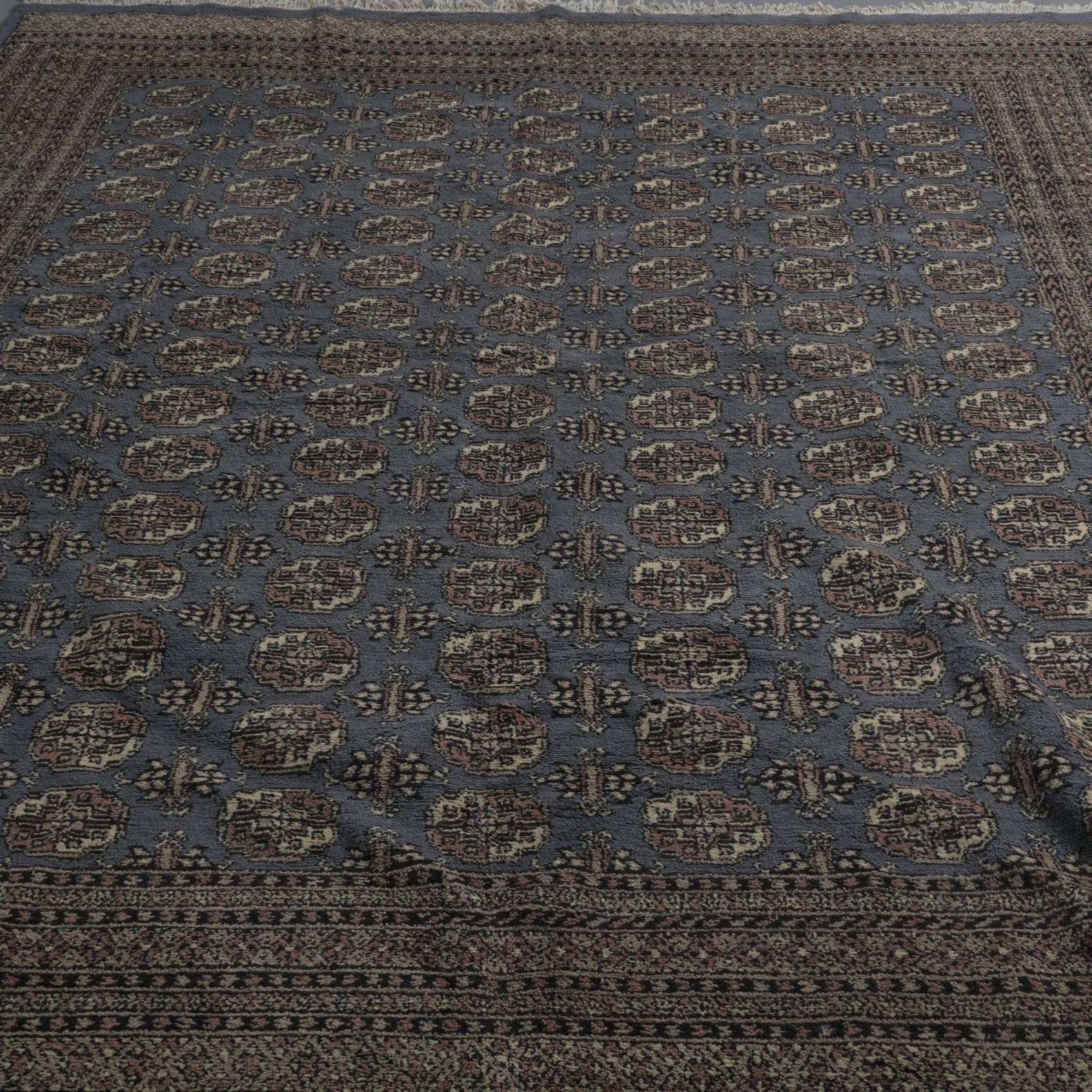 A LARGE HANDWOVEN WOOLLEN TURKMEN RUG (A/F) (360CM L X 275CM W)
