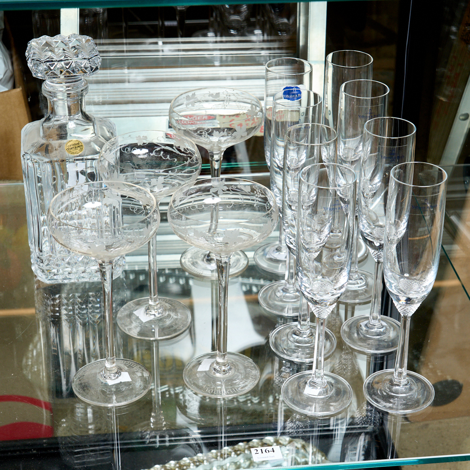 A FRENCH CRYSTAL DECANTER TOGETHER WITH A SET OF 8 VILLEROY AND BOCH CHAMPAGNE GLASSES AND FOUR ETCHED CHAMPAGNE COUPES H.25CM (TALLEST)