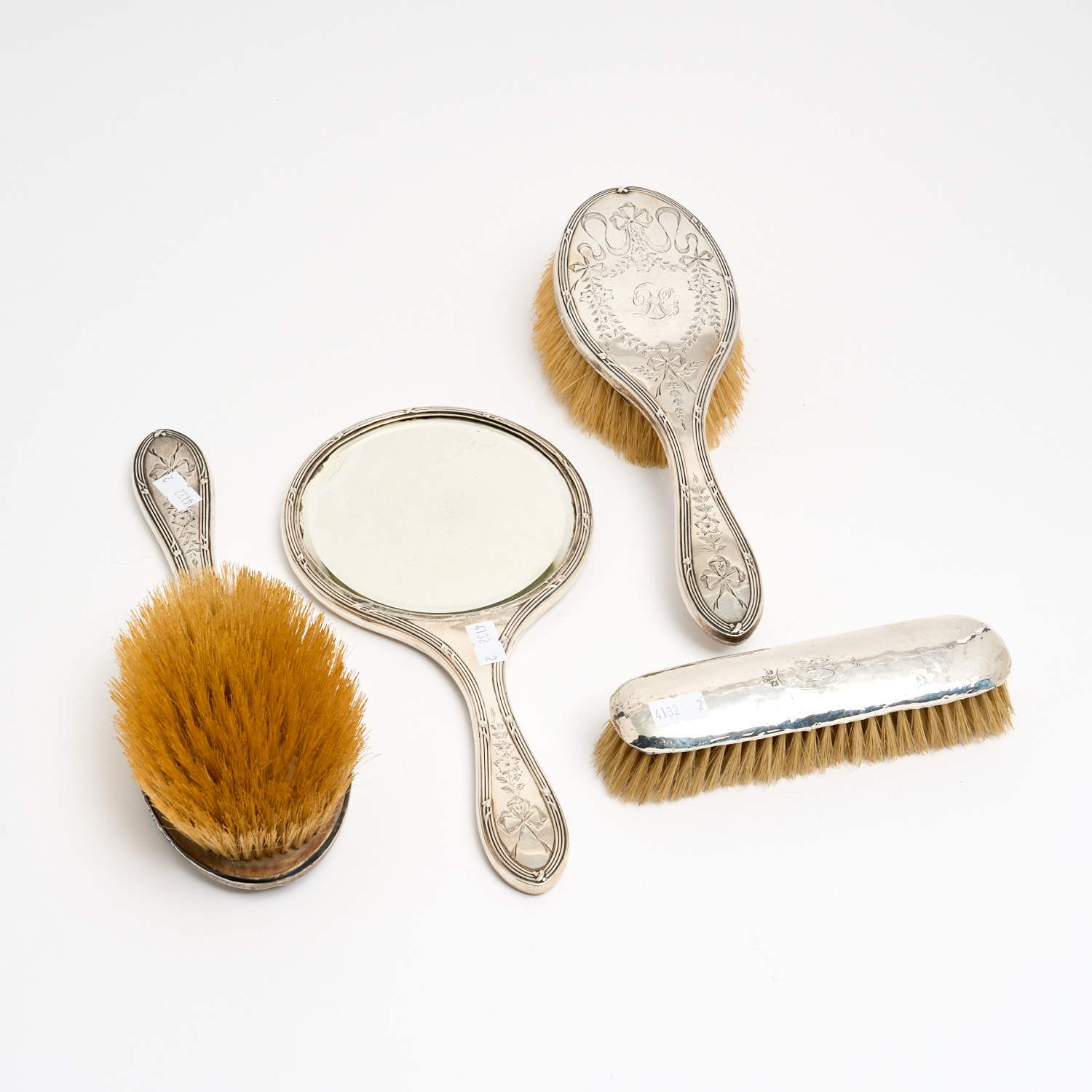 FOUR STERLING SILVER MOUNTED DRESSING TABLE ITEMS INCLUDING TWO HAIR BRUSHES, A CLOTHES BRUSH, AND HAND MIRROR L.25.5CM (LARGEST)