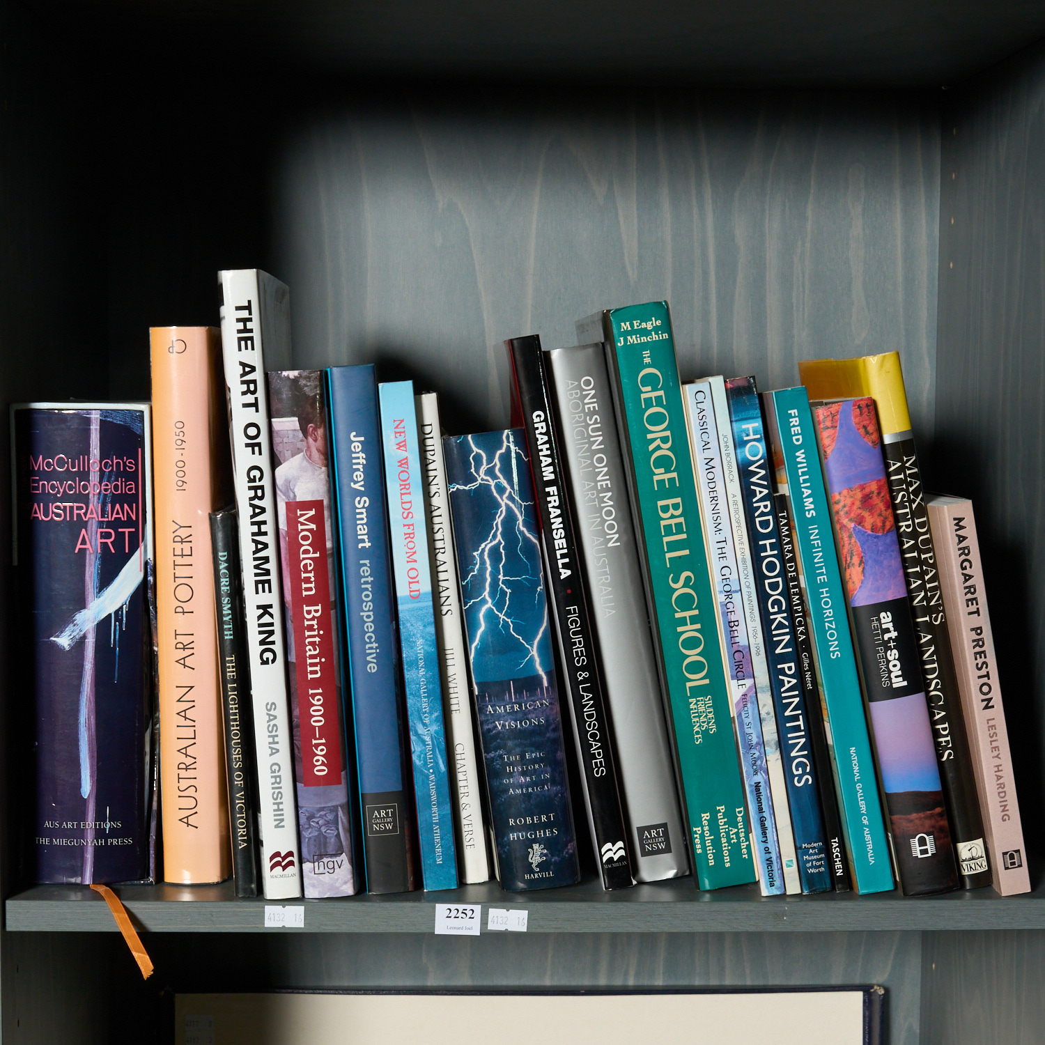 A SHELF OF AUSTRALIAN ART REFERENCE INCLUDING THE GEORGE BELL SCHOOL, MAX DUPAIN'S AUSTRALIAN LANDSCAPE, AND AUSTRALIAN ART POTTERY 1900-1950