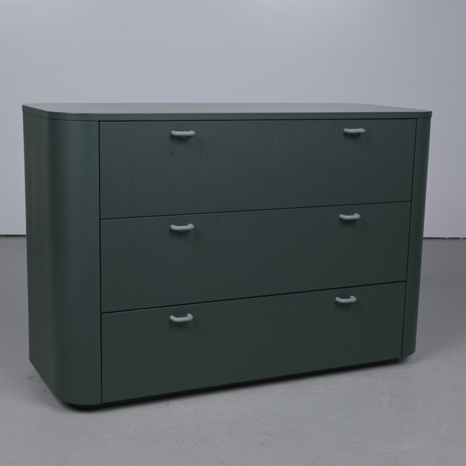 A CONTEMPORARY GREEN CHEST OF DRAWERS (80CM H X 118CM W X 50CM D) (THIS ITEM MUST BE REMOVED BY PROFESSIONAL CARRIERS OR CLIENTS. LEONARD JOEL STAFF CANNOT ASSIST WITH CARRYING OR DELIVERY OF THIS ITEM)