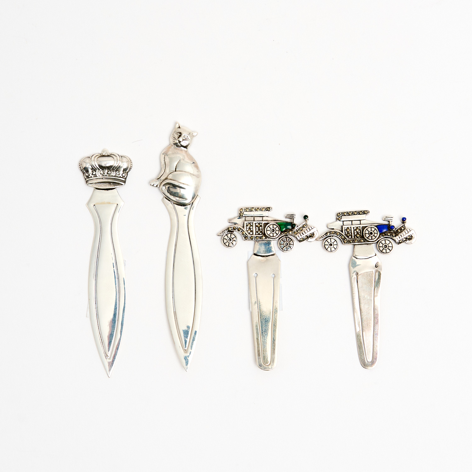 FOUR 925 SILVER BOOKMARKS, INCLDING A CAT, A CROWN AND TWO CARS, AS NEW, (NO VISIBLE HALLMARKS ON TWO) L.5CM