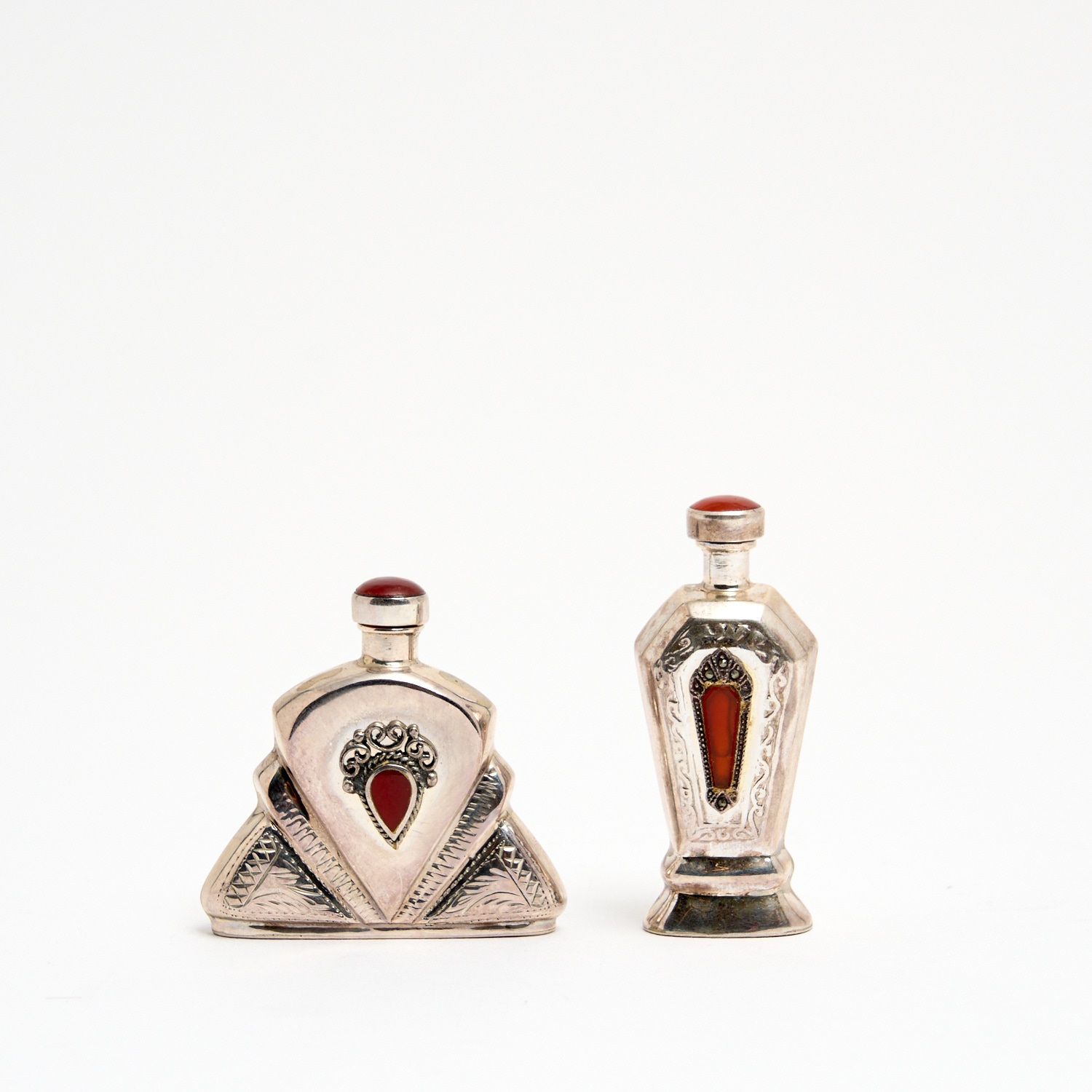 TWO STERLING SILVER PERFUME BOTTLES INSET WITH AGATE L.5CM (LARGEST)