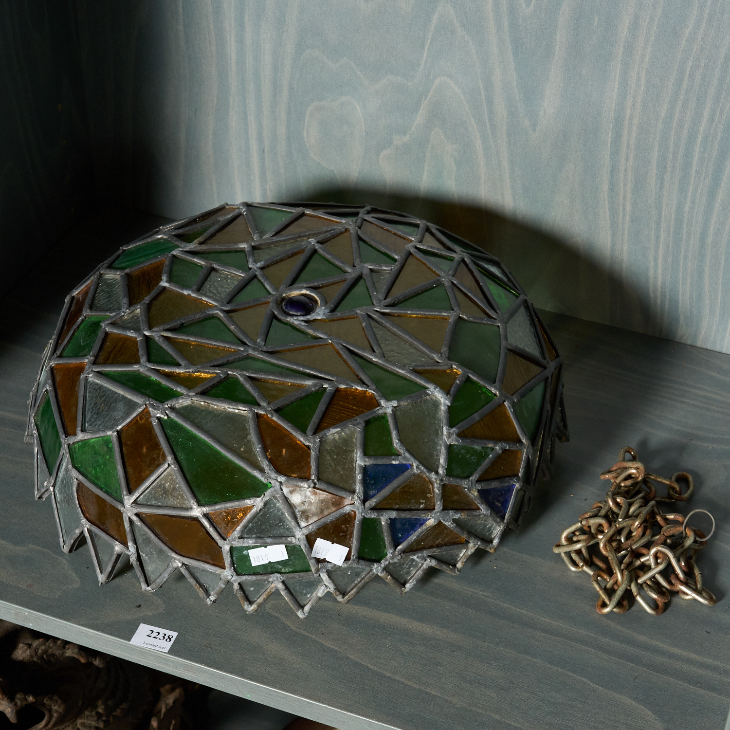 AN ART DECO LEAD LIGHT CEILING SHADE, WITH CHAIN DIA.35CM