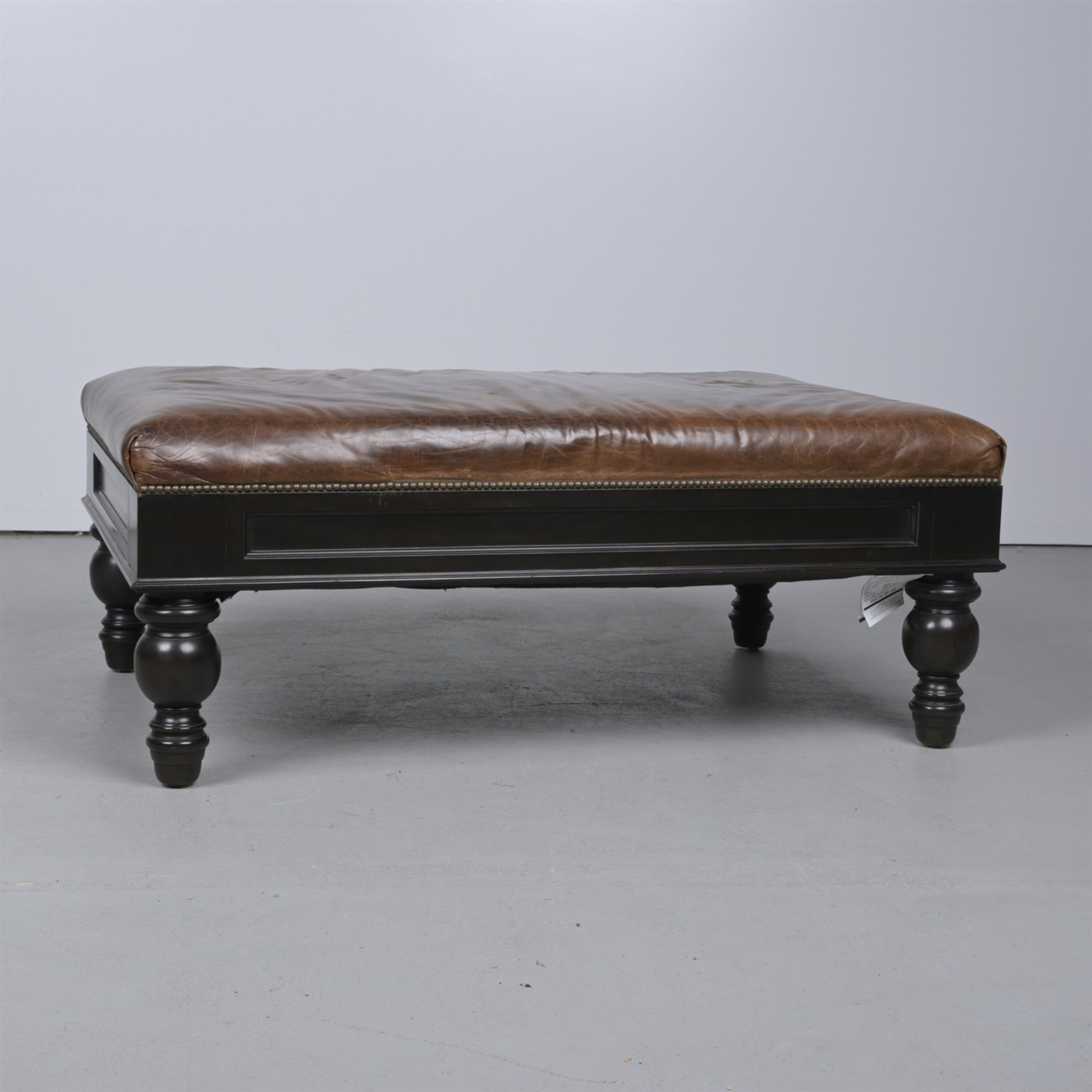 A LEATHER OTTOMAN ON EBONISED BASE BY DREXEL FURNITURE (58CM H X 138CM W X 92CM D) (THIS ITEM MUST BE REMOVED BY PROFESSIONAL CARRIERS OR CLIENTS. LEONARD JOEL STAFF CANNOT ASSIST WITH CARRYING OR DELIVERY OF THIS ITEM)