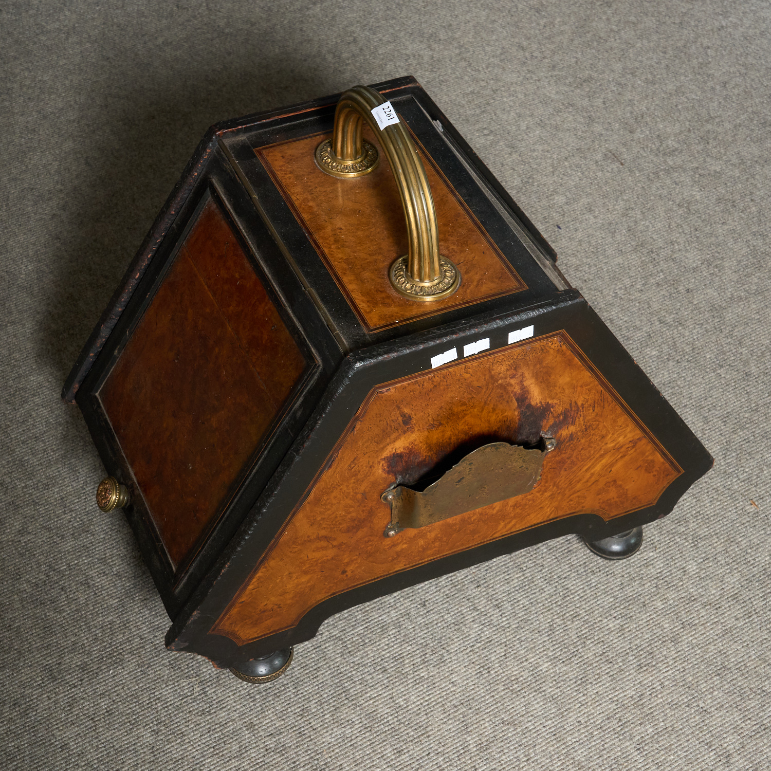 AN ANTIQUE FRENCH WALNUT AND EBONY BRONZE HANDLED COAL SCUTTLE L.54CM