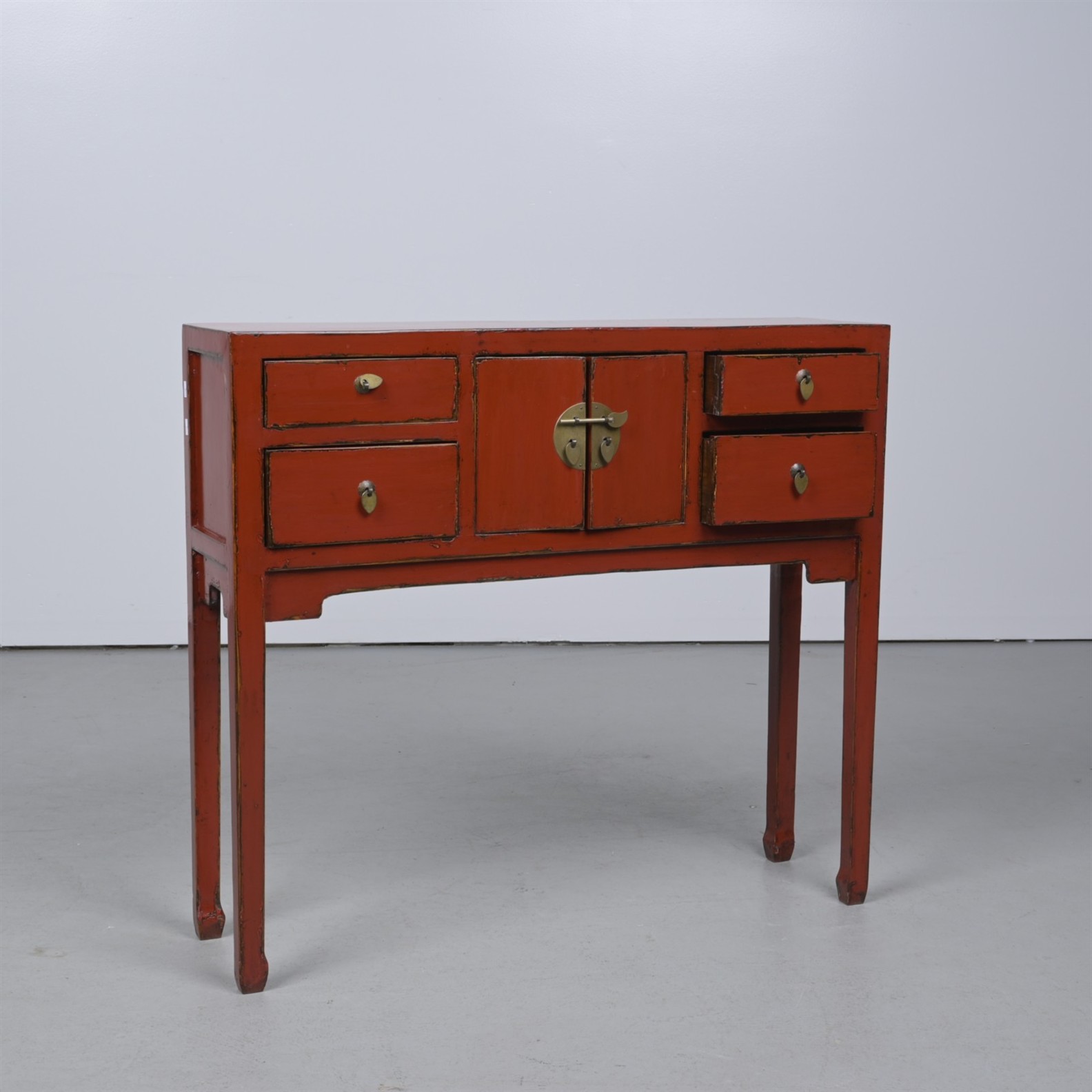 A CHINESE RED-LACQUERED ELM SIDE TABLE (87CM H X 97CM W X 26CM D)