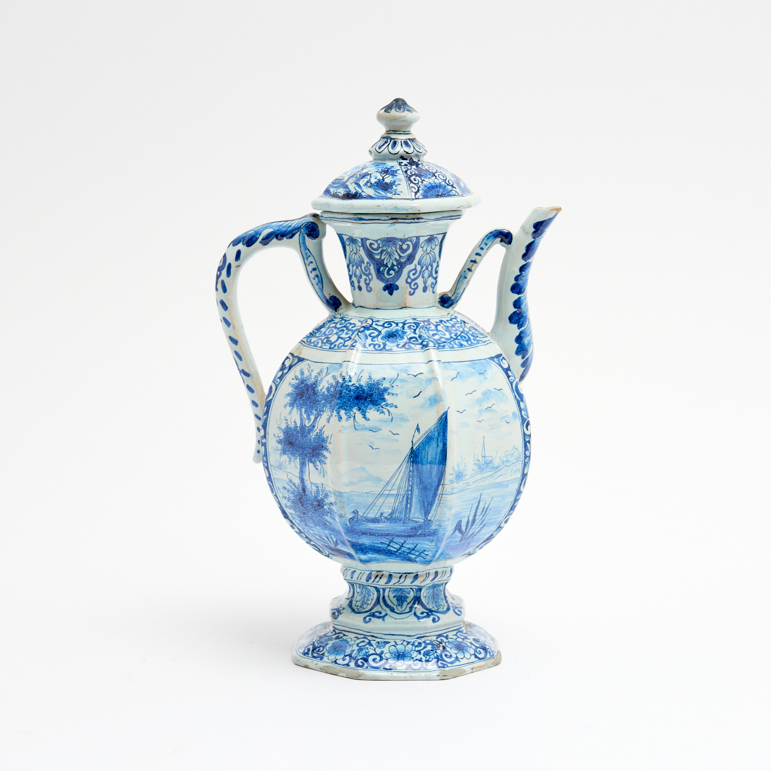 AN 18TH CENTURY DUTCH BLUE AND WHITE SIGNED TIN GLAZE LID TEAPOT H.27CM