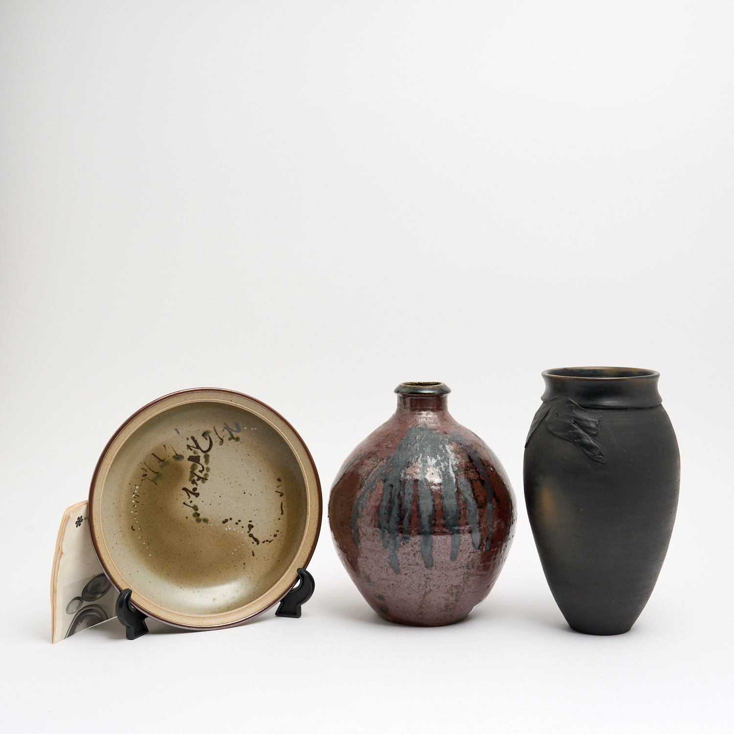 TWO CERAMIC POTS BY PENNY LINDEMAN TOGETHER WITH A CERAMIC PLATE BY TIM JACOBS H.28CM