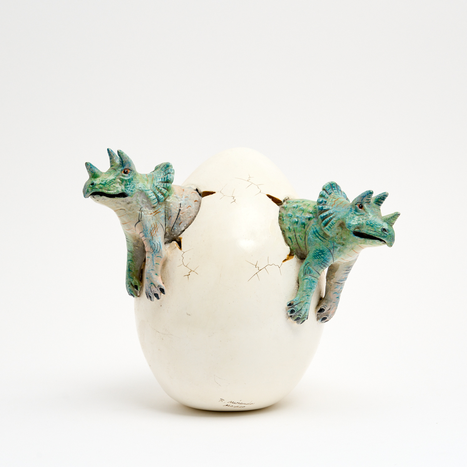 A MEXICAN FOLK ART CERAMIC EGG WITH TWO DINOSAURS HATCHING, BY R. MIRANDA H.22CM
