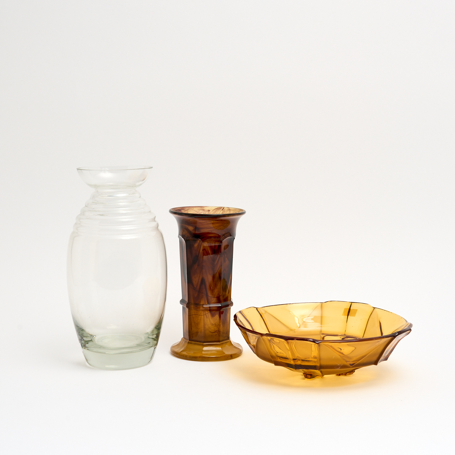 A TRIO OF DECO/ DEPRESSION AGE GLASS INCLUDING BY GEORGE DAVIDSON, STOLZLE AND A LARGE BLOWN BEEHIVE VASE