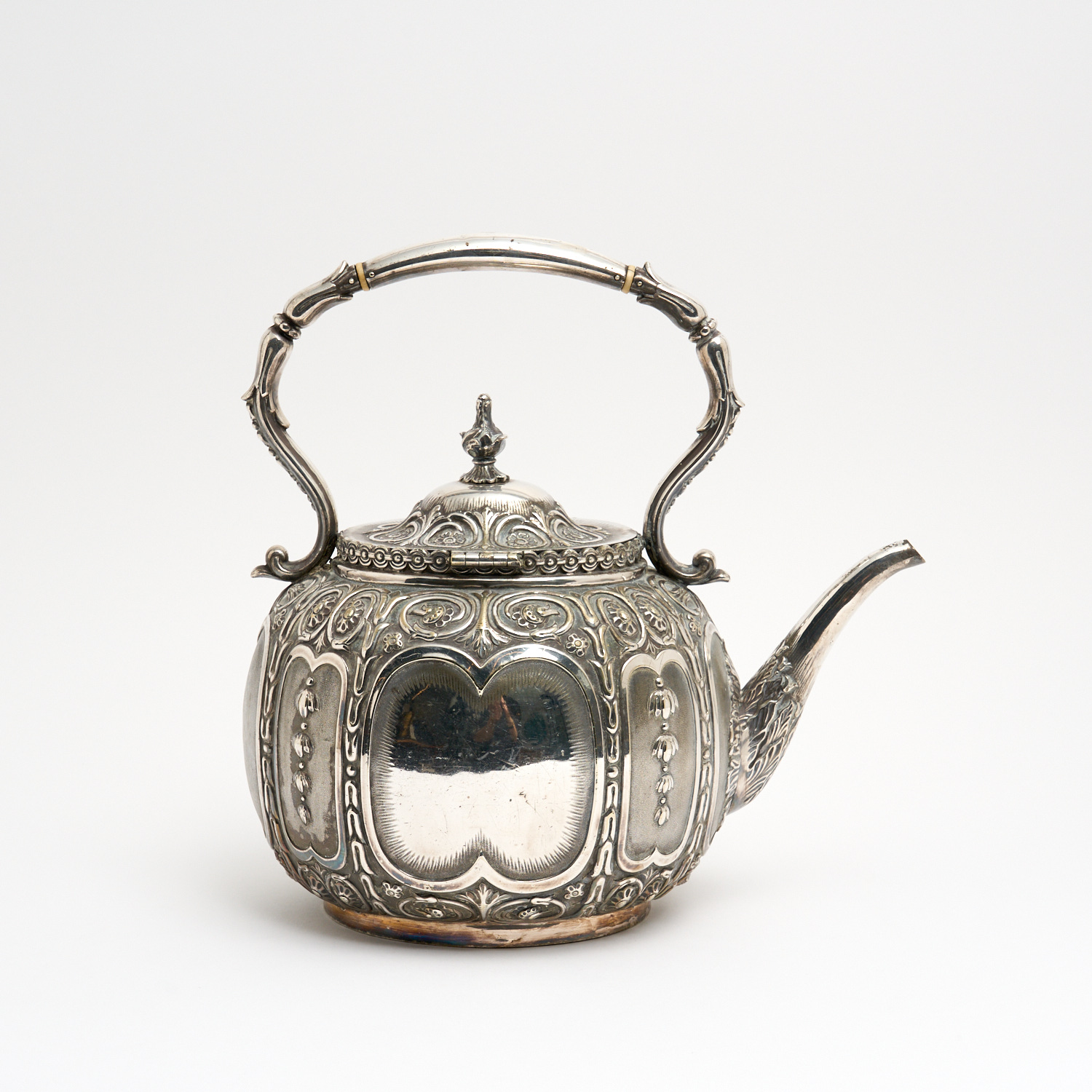A LARGE SILVER PLATE SPIRIT KETTLE H.32CM