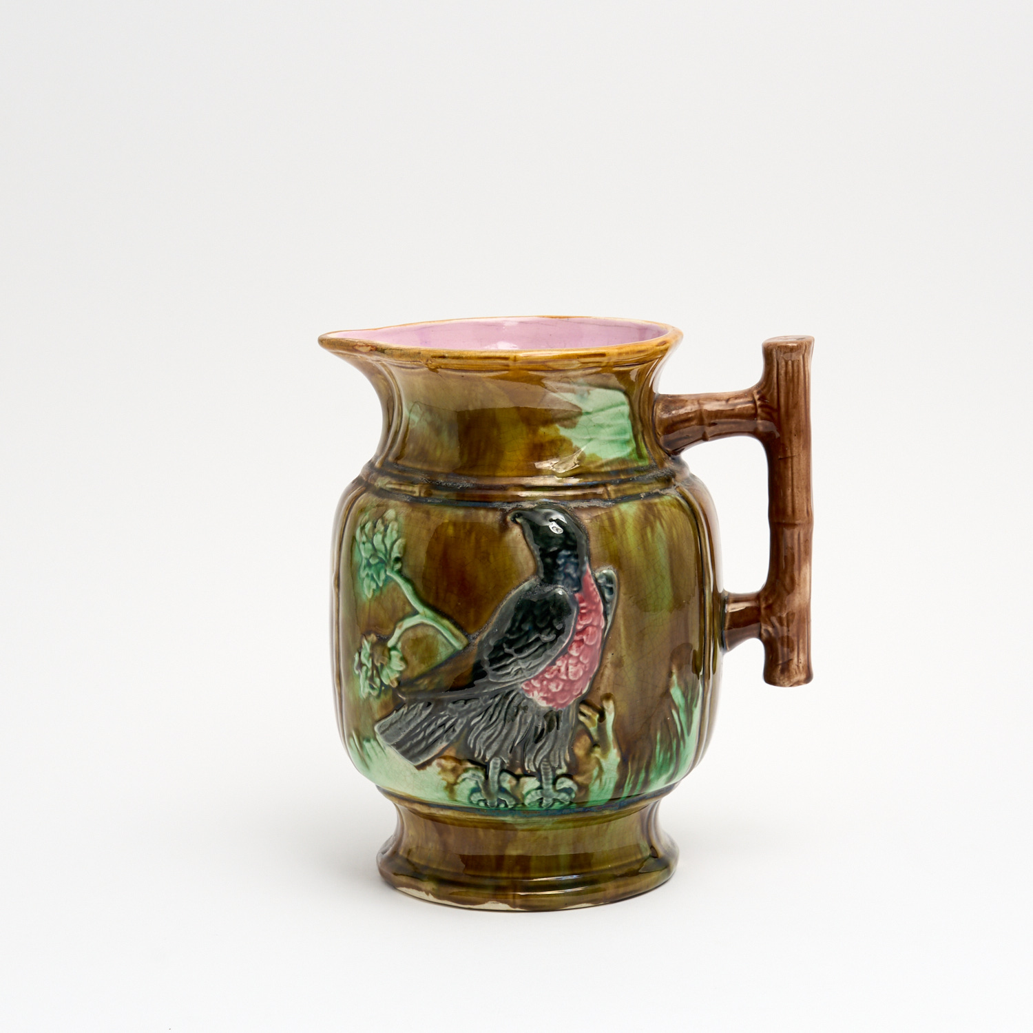 A LARGE VICTORIAN MAJOLICA PITCHER WITH BIRD DECORATION AND BRANCH FORM HANDLE (HAIRLINE TO BASE) H.23CM
