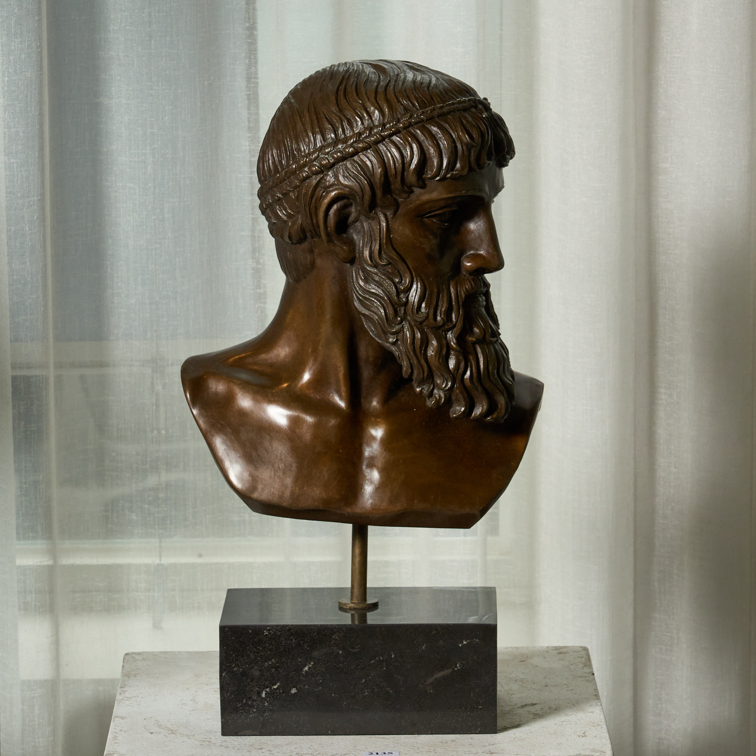 AFTER POSEIDON OF ARTEMISION, A BRONZE BUST MOUNTED ON PLINTH H.50CM (TOTAL)