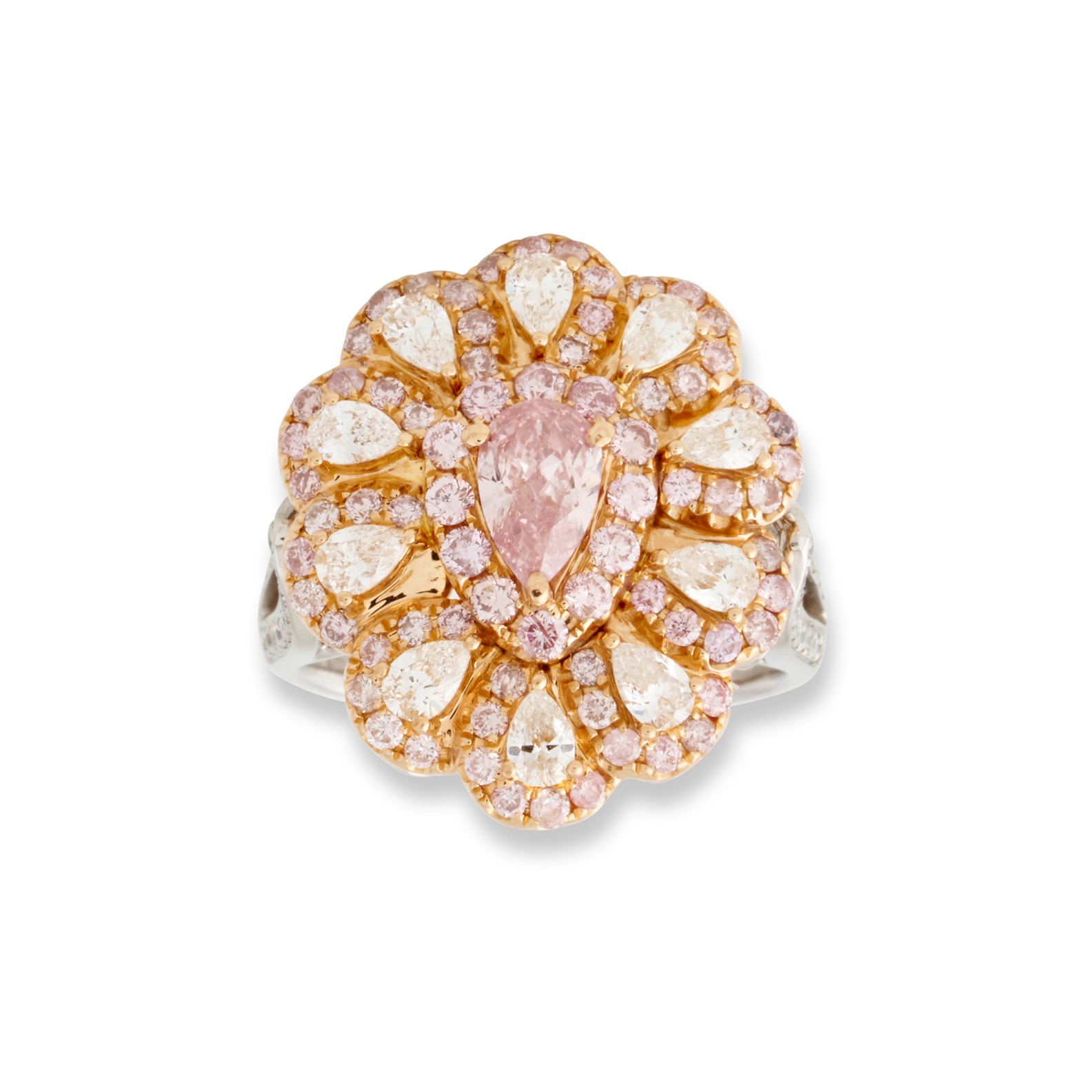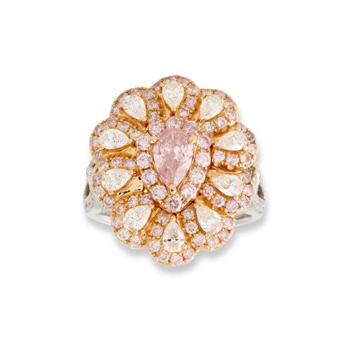 Of cluster design, centring a claw-set pear modified brilliant-cut fancy intense pink diamond weighing 0.53 carats, framed by a halo of fancy light pink brilliant-cut diamonds further bordered by a line of near colourless pear-shaped diamonds framed by pink diamonds, between openwork shoulders pavé-set with near colourless brilliant-cut diamonds, the near colourless and fancy light pink diamonds together weighing 0.88 carats and 0.84 carats respectively, mounted in platinum and 18ct gold, ring size L, gross weight approximately 10.0 grams.