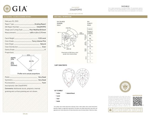 Accompanied by a GIA report (gia.edu/report-check-landing) numbered 2346093992, dated 3 February 2020, stating that the 0.53 carat diamond is natural, fancy intense pink colour, I1 clarity, laser inscribed.