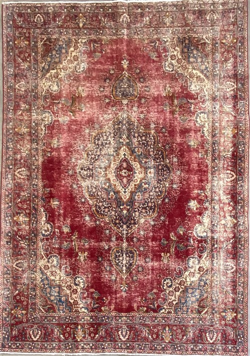 VINTAGE PILE. CLASSIC DESIGN OF A BOLD CHANDELIER MEDALLION & QUARTERED CORNER MEDALLIONS IN AN OPEN RUBY RED FIELD. BORDER OF PALMETTES. A UNIQUE MODERN RUG CREATED FROM AN ORIGINAL HAND-KNOTTED TABRIZ CARPET HAND-CARVED TO CREATE A DISTRESSED AND VINTAGE LOOK. GALLERY DISPLAYED.