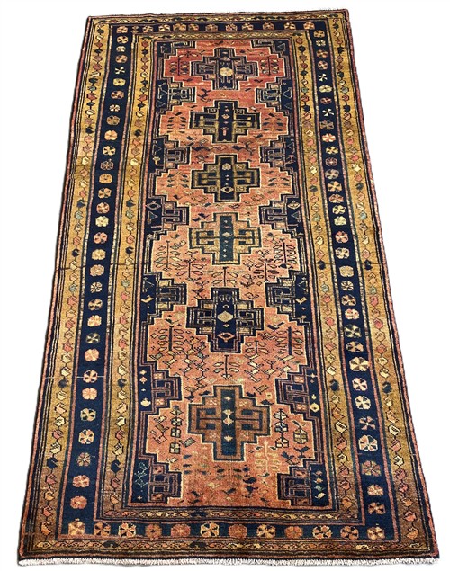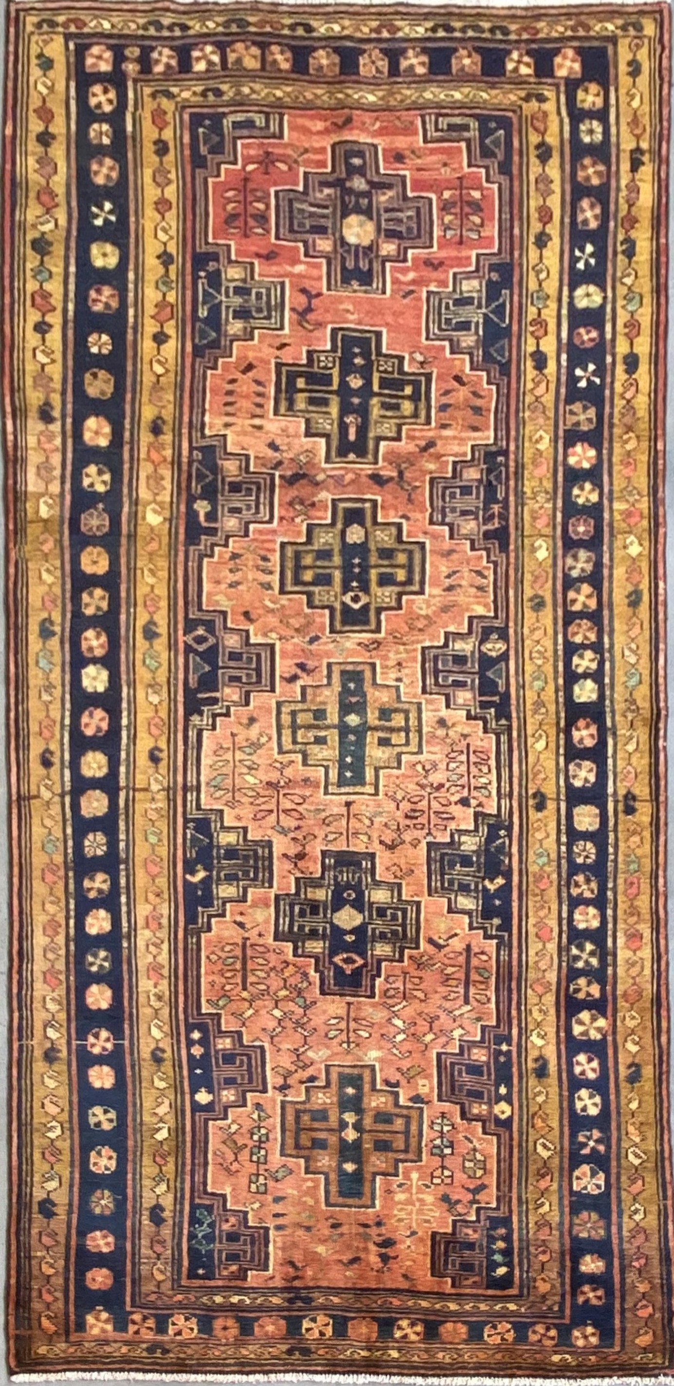 WOOLLEN AND NATURAL VEGETABLE DYES WITH ABRASH COLOUR VARIATION. HAND-KNOTTED NOMADIC WEAVE FROM THE LORESTAN PROVINCE WITH TRIBAL DESIGN OF REPEATING CROSS-SHAPED MEDALLIONS IN A FIELD OF LEAFY BRANCHES. BORDER OF FLOWER HEADS.