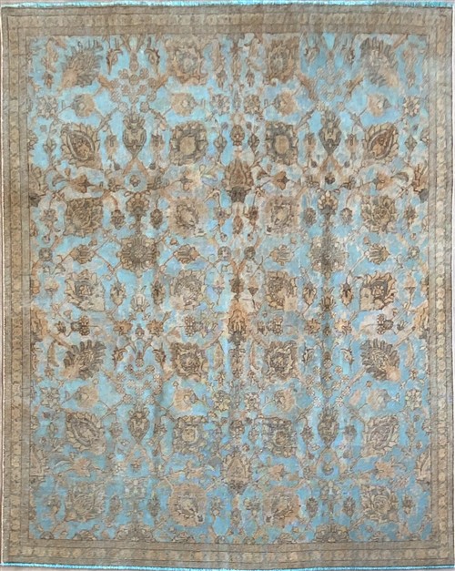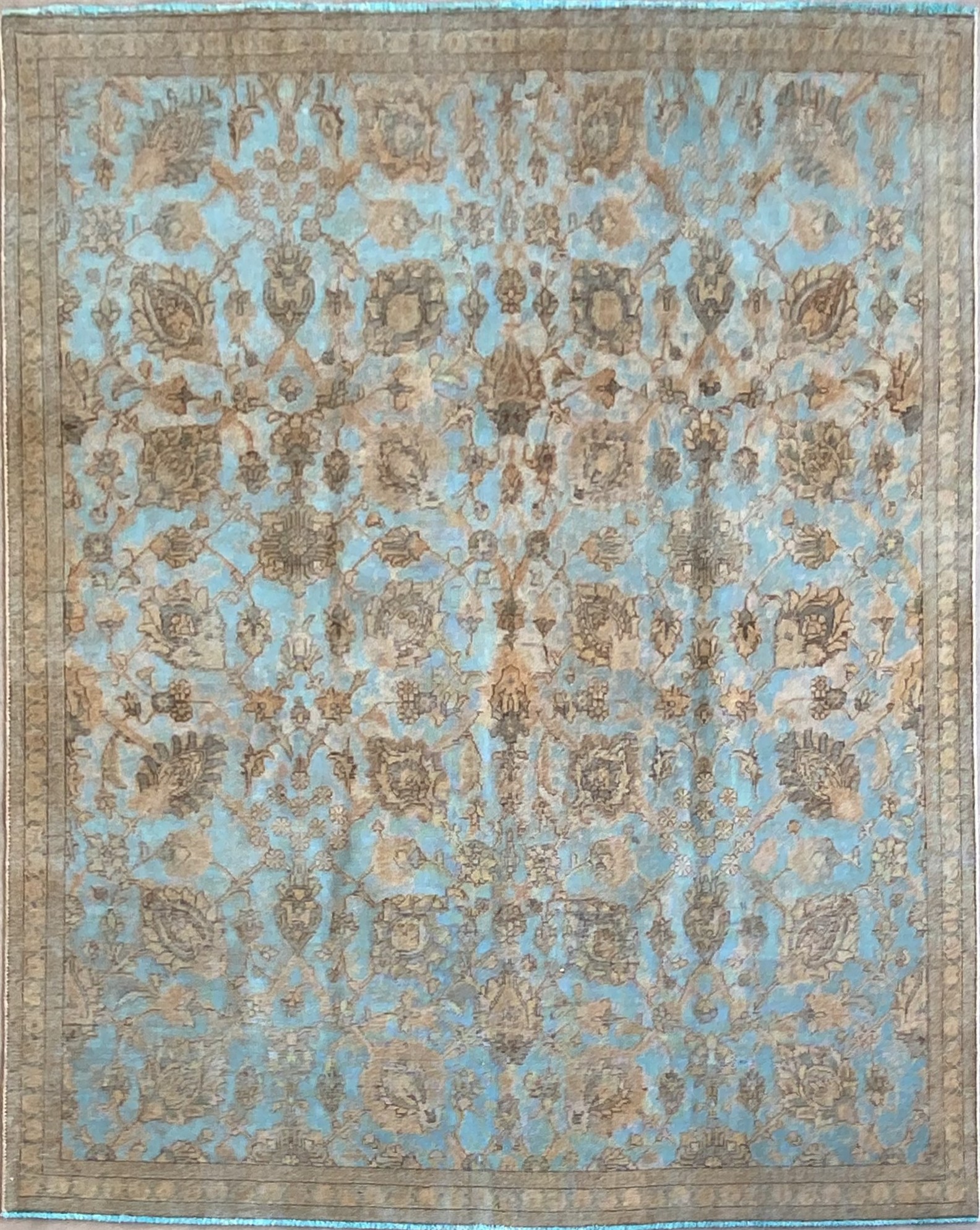 CREATED FROM AN ORIGINAL HAND-KNOTTED ALL-OVER PALMETTE DESIGN TABRIZ CARPET OVER-DYED IN SHADES OF TURQUOISE, PEACH & CARAMEL.