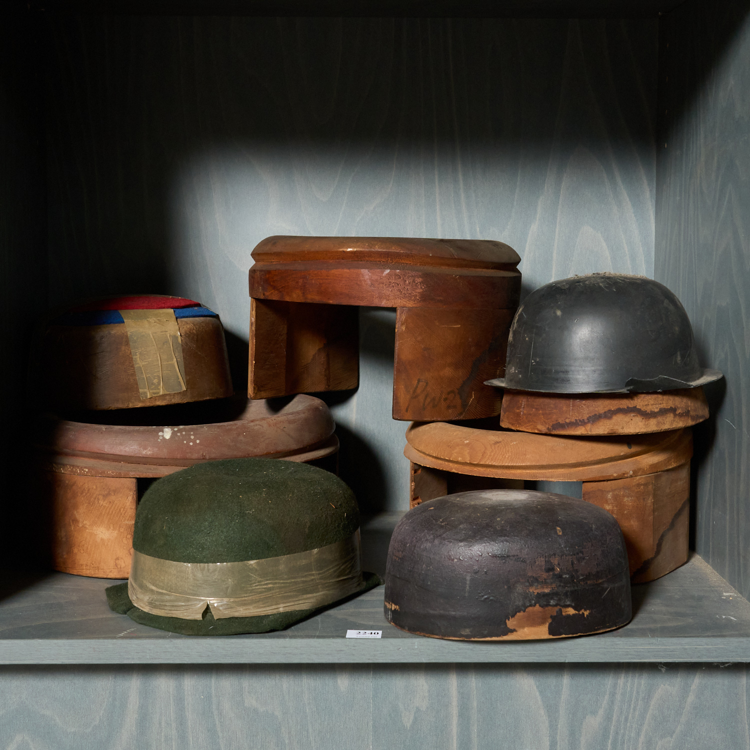 FOUR VINTAGE HAT BLOCKS AND THREE BRIM BLOCKS L.28CM
