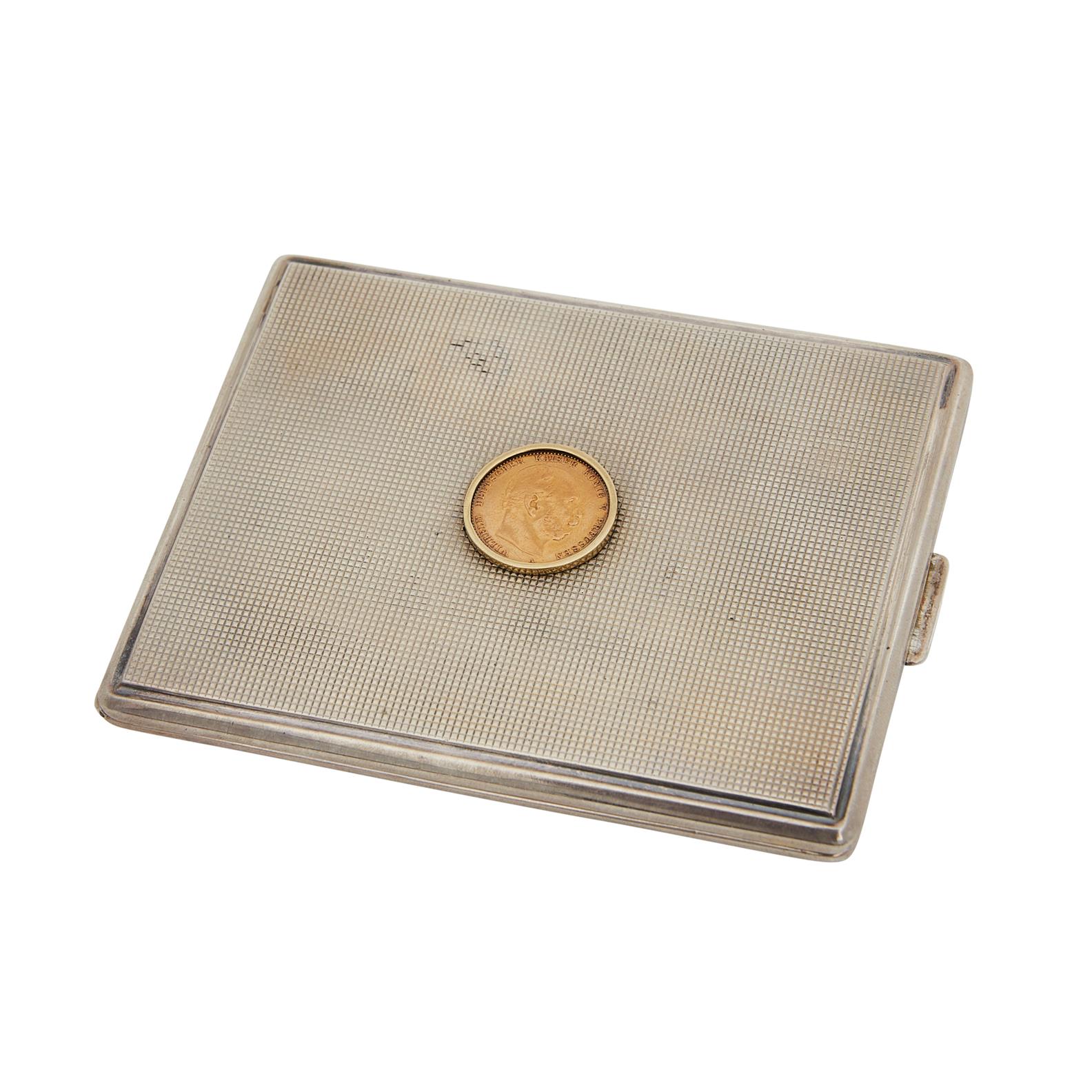 Marked '835 ST', rectangular with push thumb piece, set to the centre with a gold coin of Wilhelm I of Prussia on a machined ground, with gilt interior.