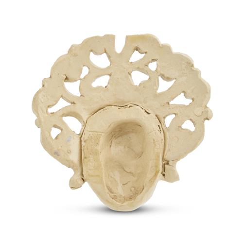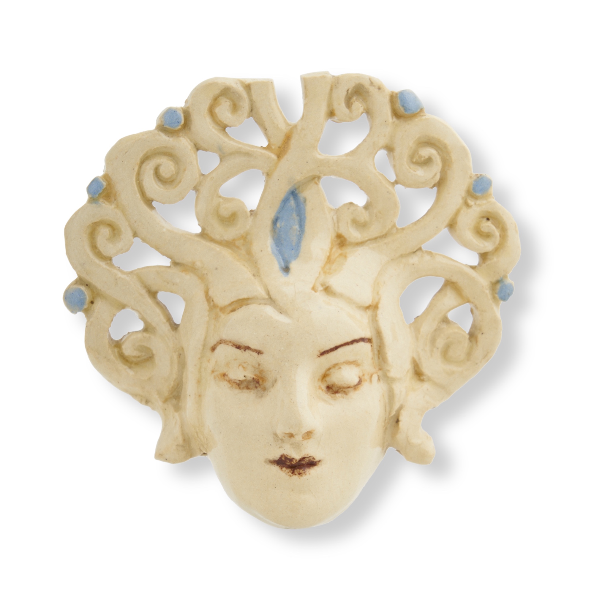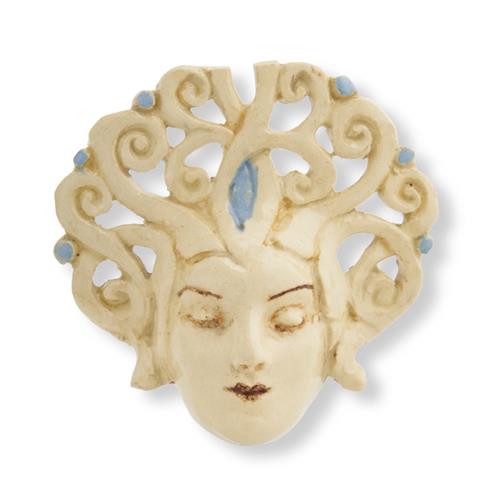 Modelled as a female with closed eyes and a serene expression, wearing an elaborate pierced and incised scrolling headdress, with blue accents on a cream ground, incised signature 'Mahood' and numbered 'F1246' to reverse