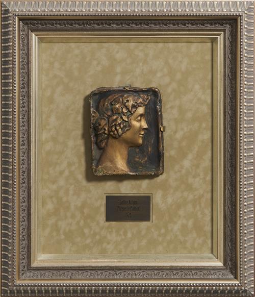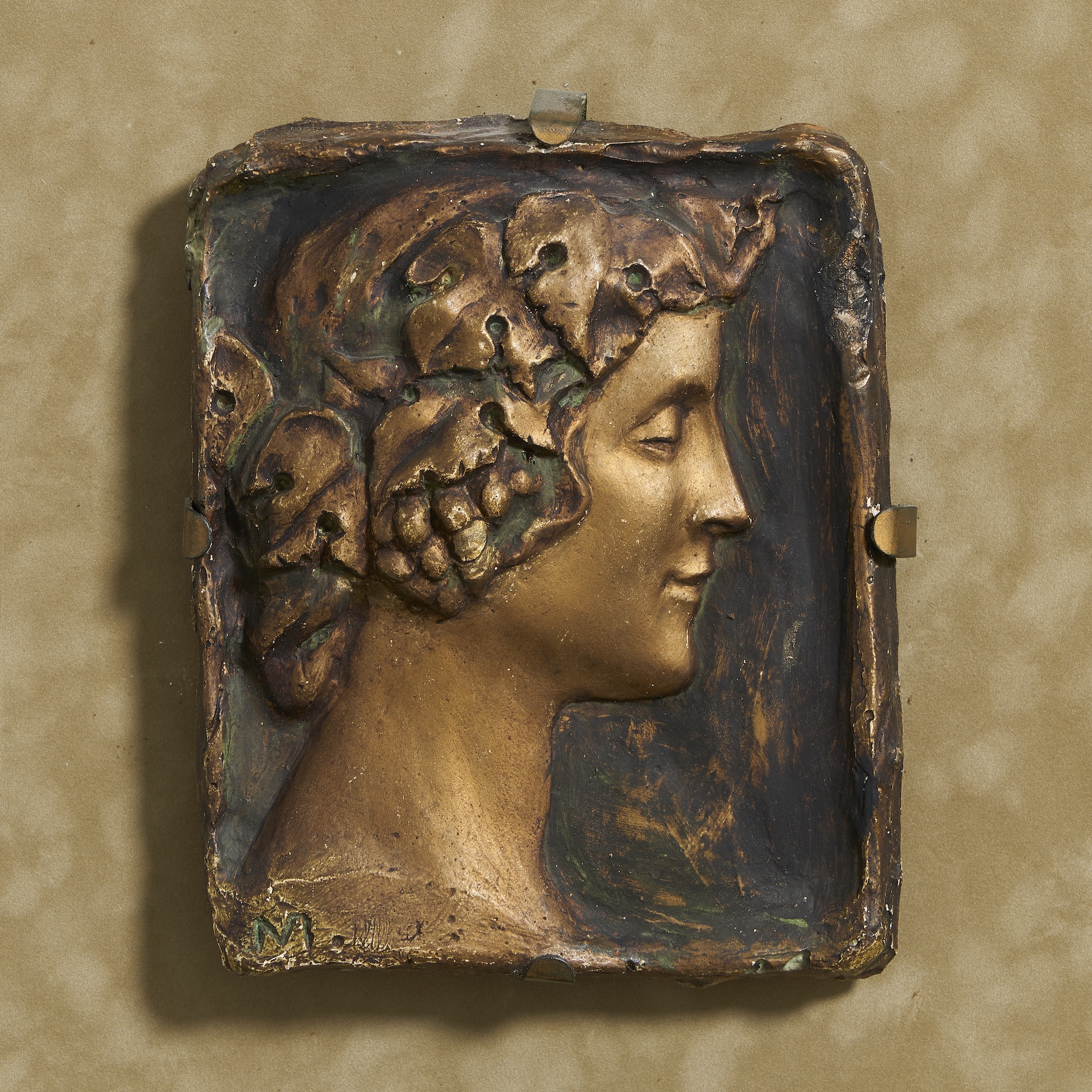 Rectangular, modelled in relief with a classical female head in profile to the right, with grapes and vine leaves in her hair, decorated in dull gold, verdigris, and brown simulating bronze, incised signature 'M' lower left, mounted and framed, inscribed as title and dated on an engraved plaque to the mount