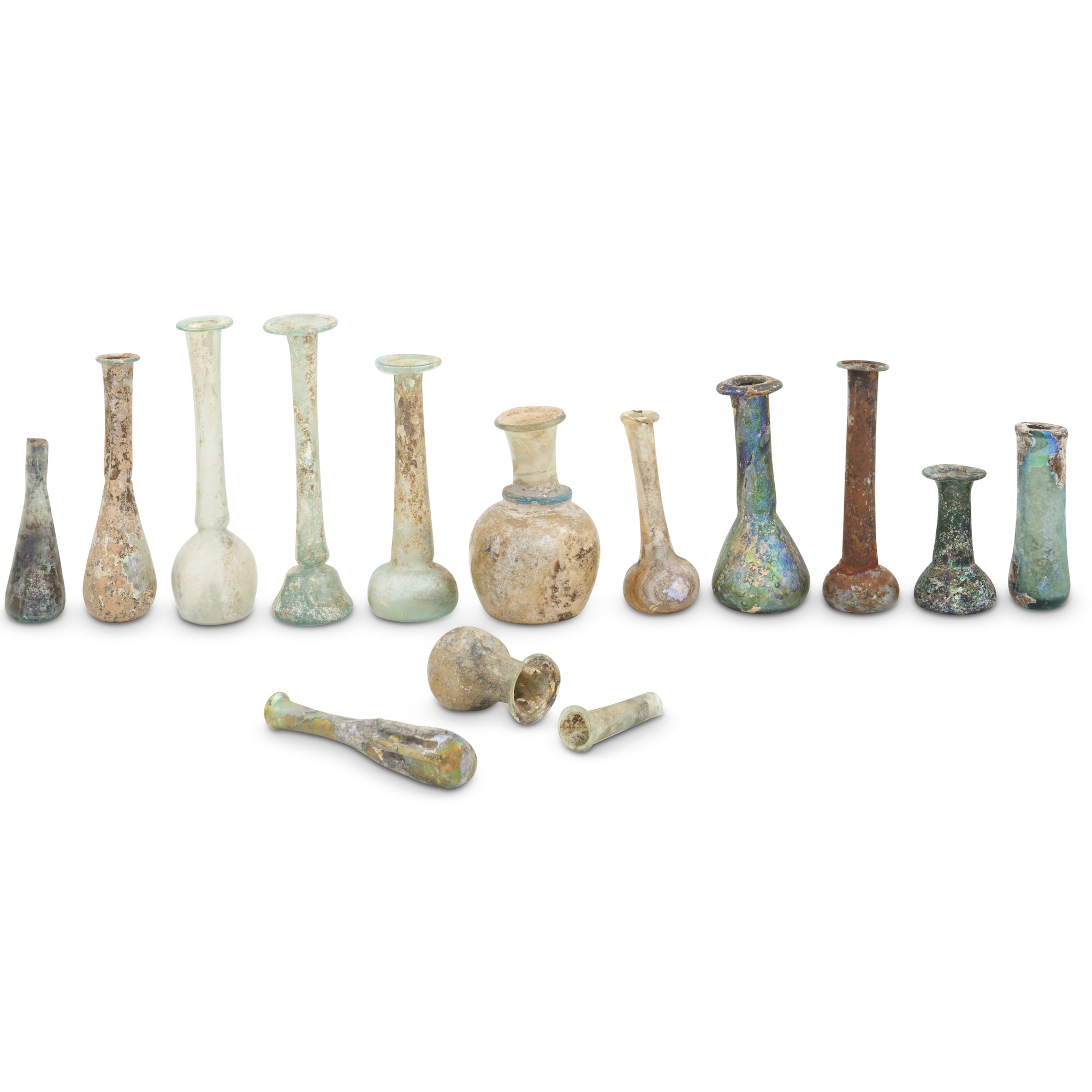 Variously tapering and bulbous-formed, in pale-dark green iridescent glass, predominately unguentaria and smaller flasks