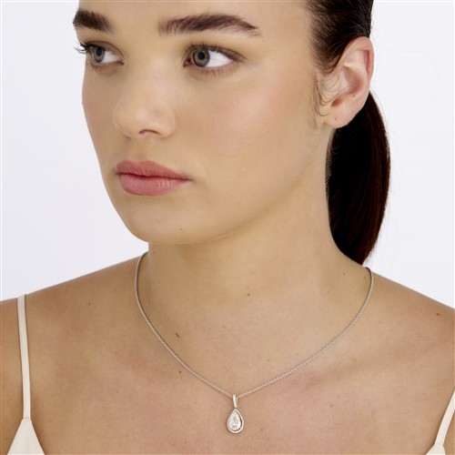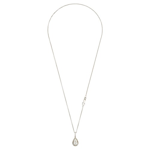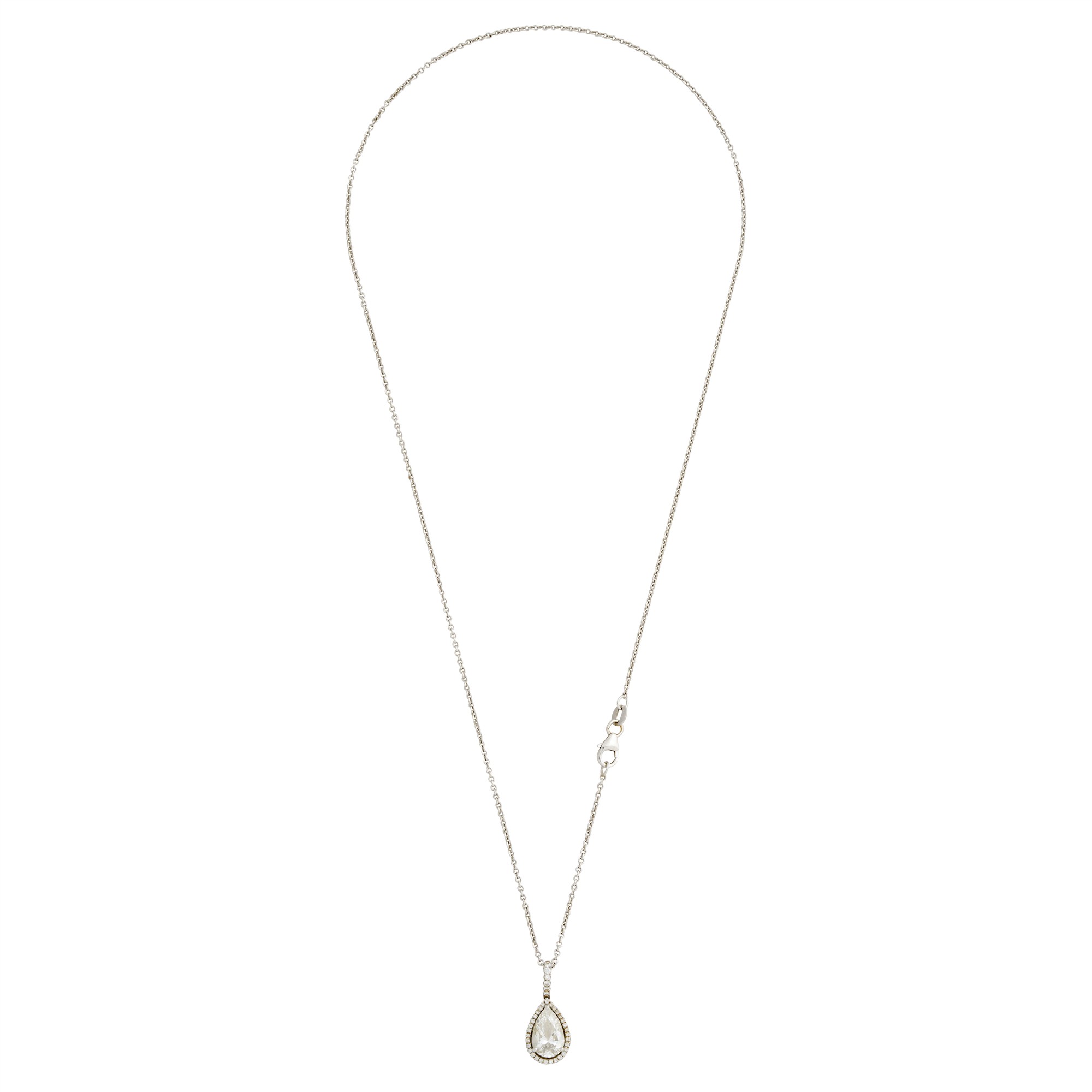 Comprising a claw-set, pear shaped diamond weighing approximately 2.02 carats, to a surround and articulated bail of claw-set round brilliant-cut diamonds, suspended from a cable link chain, completed by a parrot clasp, length 450mm, gross weight approximately 6.5 grams.