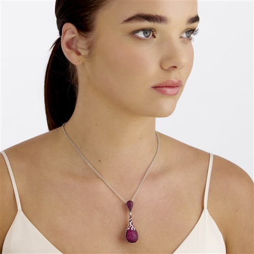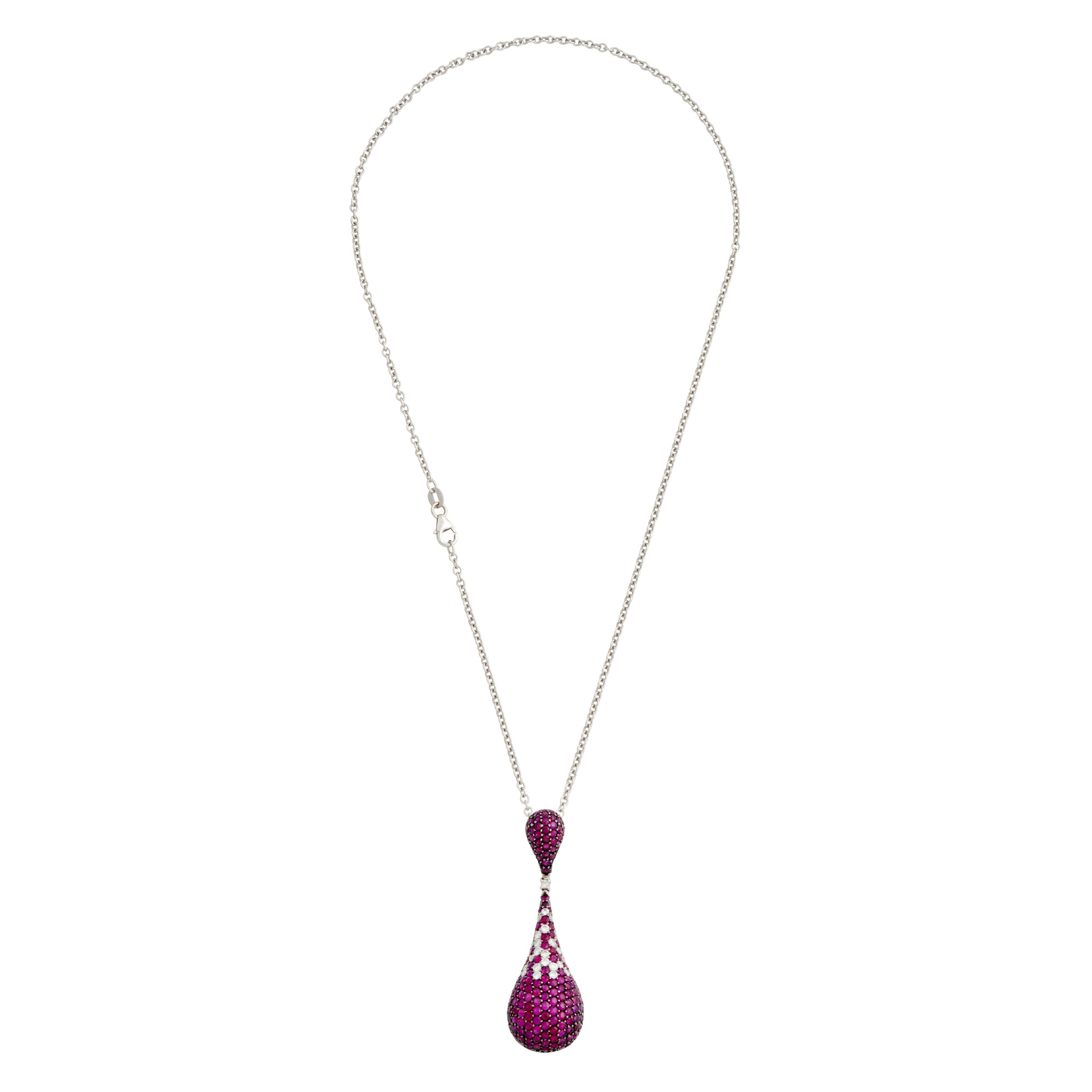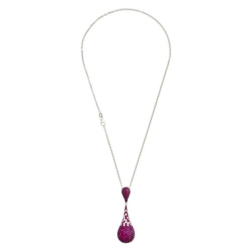 An articulating pendant comprising pave-set rubies and diamonds to a hidden bale with an open-work back of floral motif design, length approximately 450mm, pendant length approximately 60mm, width approximately 22, gross weight approximately 15.5 grams.