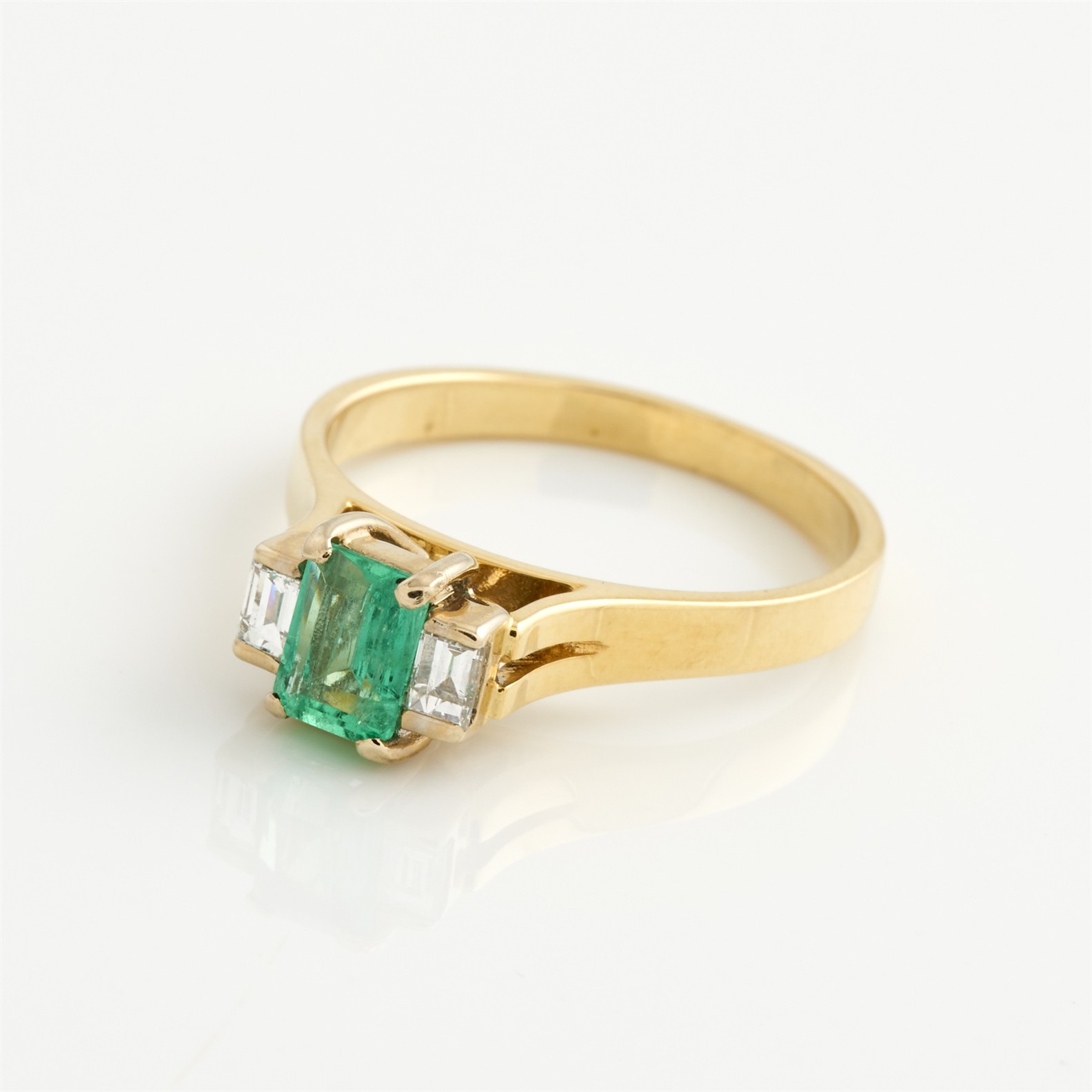 AN EMERALD AND DIAMOND RING IN 18CT TWO TONE GOLD, SIZE M 1/2, 3.4GMS