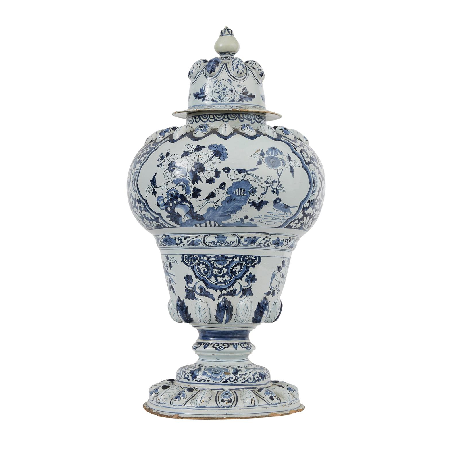 Early 18th century, of inverted baluster outline, the domed cover with moulded leaf details, the globular base and foot with similar moulded detail, painted all over with flower, tendrils, scrolls and panels of birds on rockwork, indistinctly numbered 78 to underside.