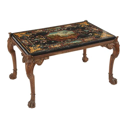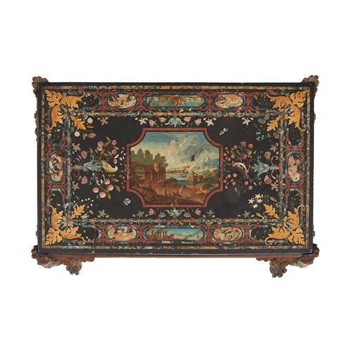 The scagliola top, first-half 18th century, having a central panel depicting an Italian landscape with Roman ruins, the black ground embellished with birds, flowers and foliage within borders having two further landscapes and faux marble medallions, and foliate designs to each corner; the base carved with fish scale decoration to the frame and cabriole legs, having green-man mask and scroll headers and hairy paw feet.