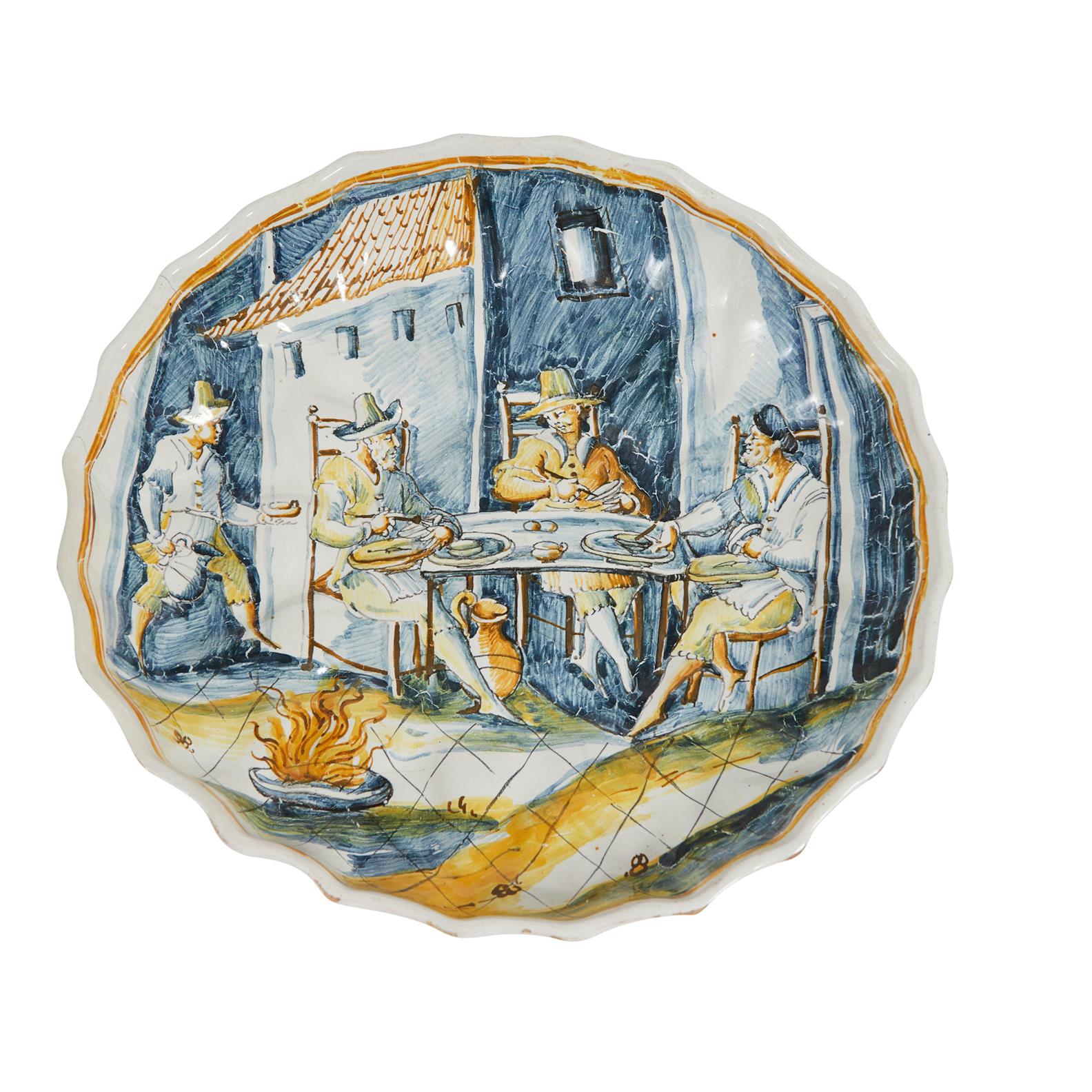 Probably Faenza, late 17th century, in the manner of the V Service Painter, painted with three men having a meal in a piazza by a brazier with a servant.