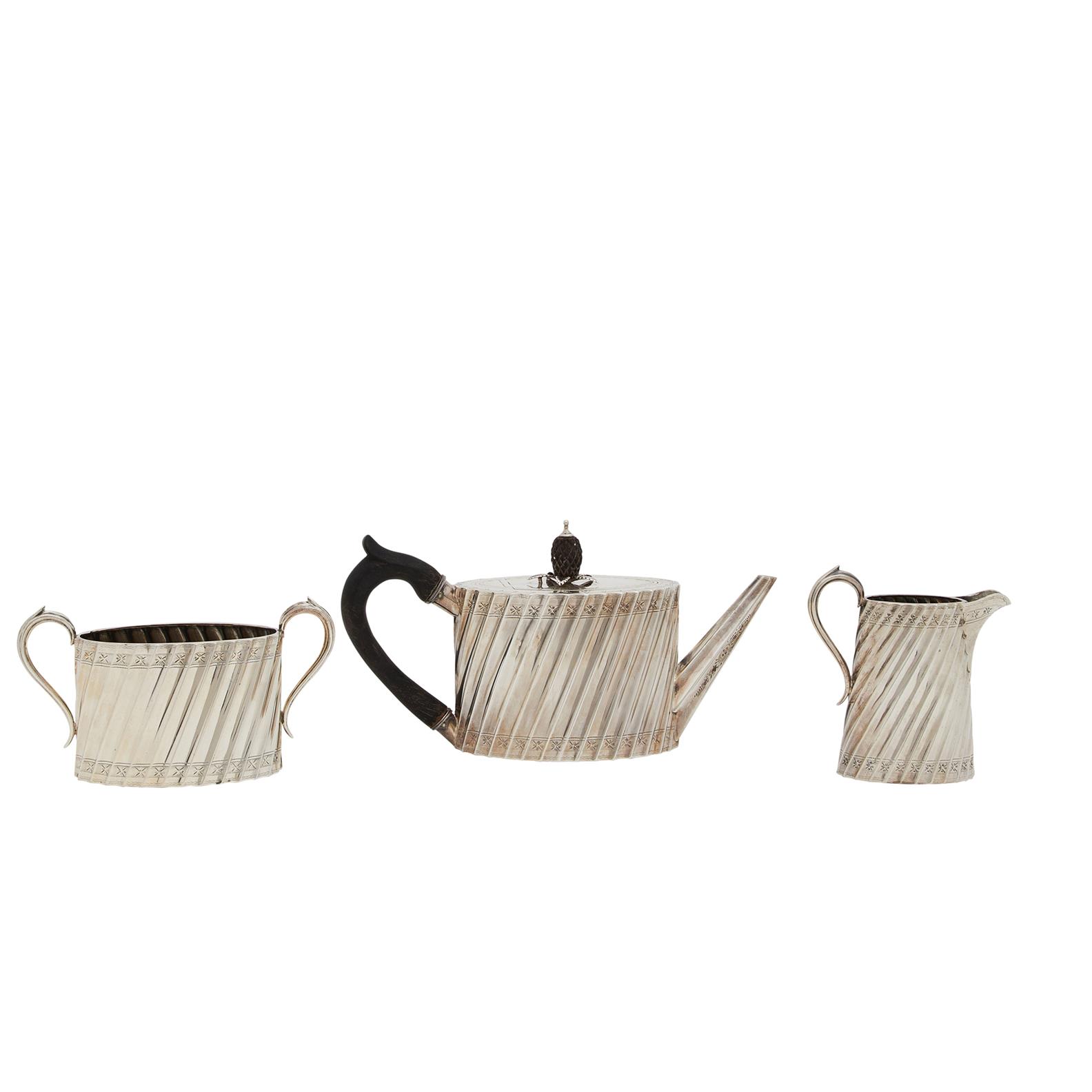 Maker's mark possibly that of Jane Brownett, London 1886, each piece shaped oval of spirally fluted design with bands of bright cut engraving, the teapot with pineapple finial.