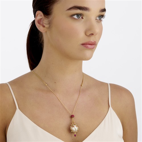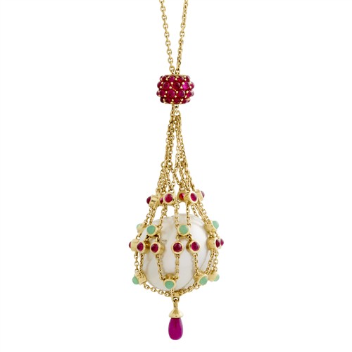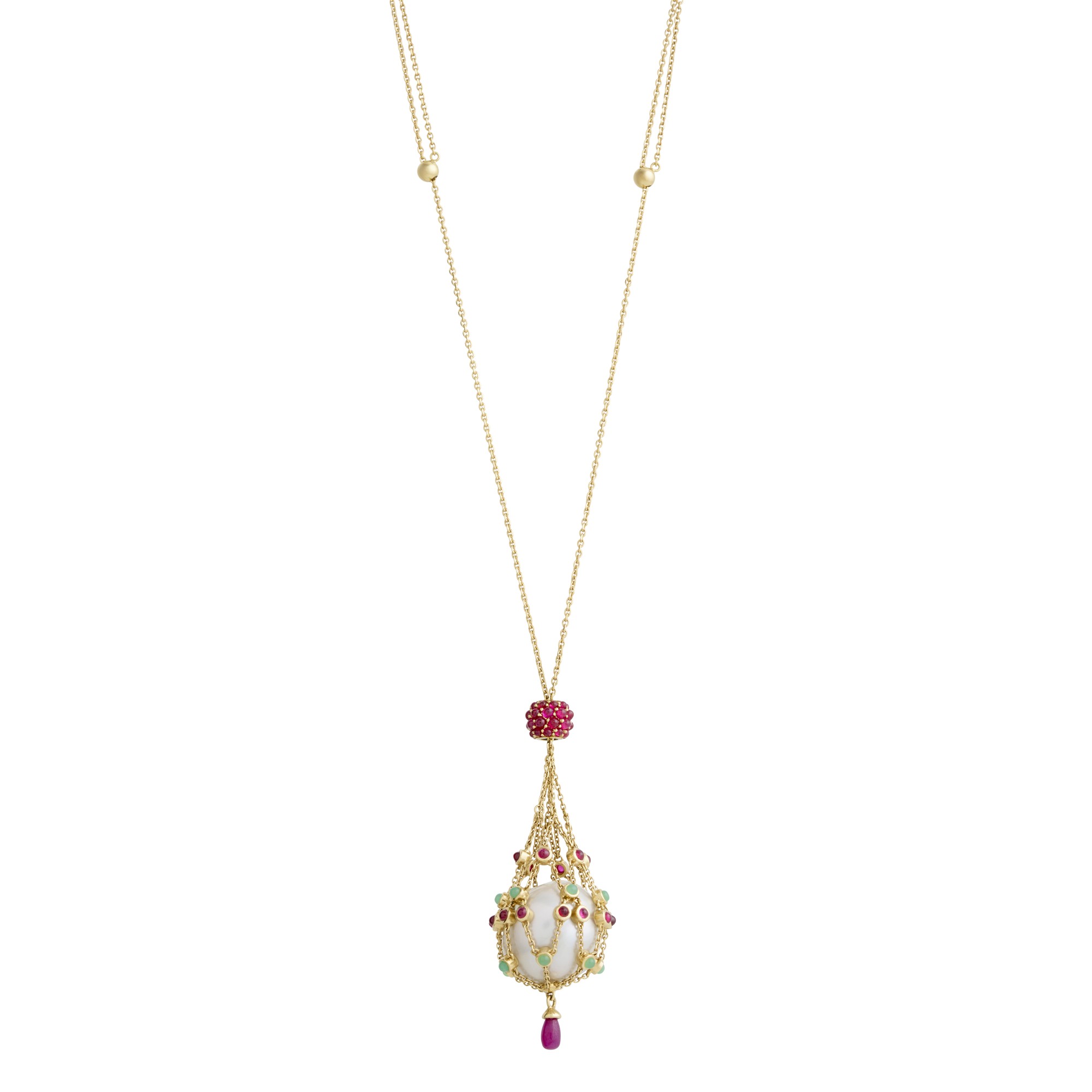 Featuring a loose south sea cerclé pearl of approximately 17.0mm held in a maritime chain net with alternating bezel-set rubies and chrysoprase plus a drop of ruby cut en-cabochon, suspended from a chain with slide of pavé-set rubies en-cabochon, the chain doubles from the spacers to a parrot clasp and diamond set charm, the rubies together weighing approximately 4.08 carats, the chrysoprase together weighing approximately 0.06 carats, length approximately 545mm, gross weight approximately 22.4 grams.