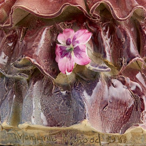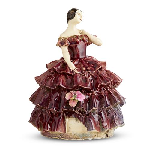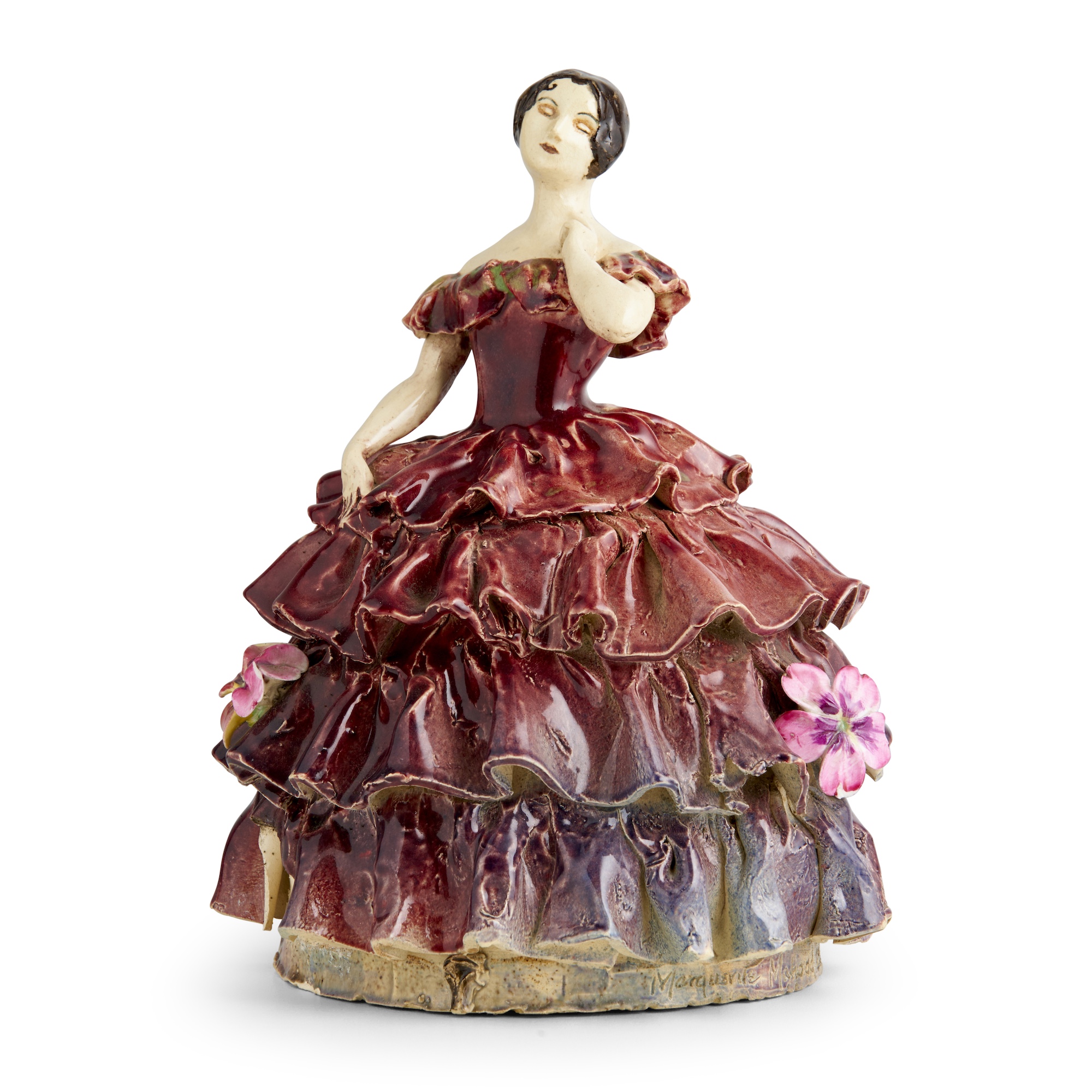 Modelled wearing an elaborate gown with applied flowers, her face tilted to one side, with one hand raised toward her neck, the other hand resting on a ruffle of her gown, incised signature 'Marguerite Mahood', with monogram, numbered 'C592' and dated 1933 to the edge of the base
