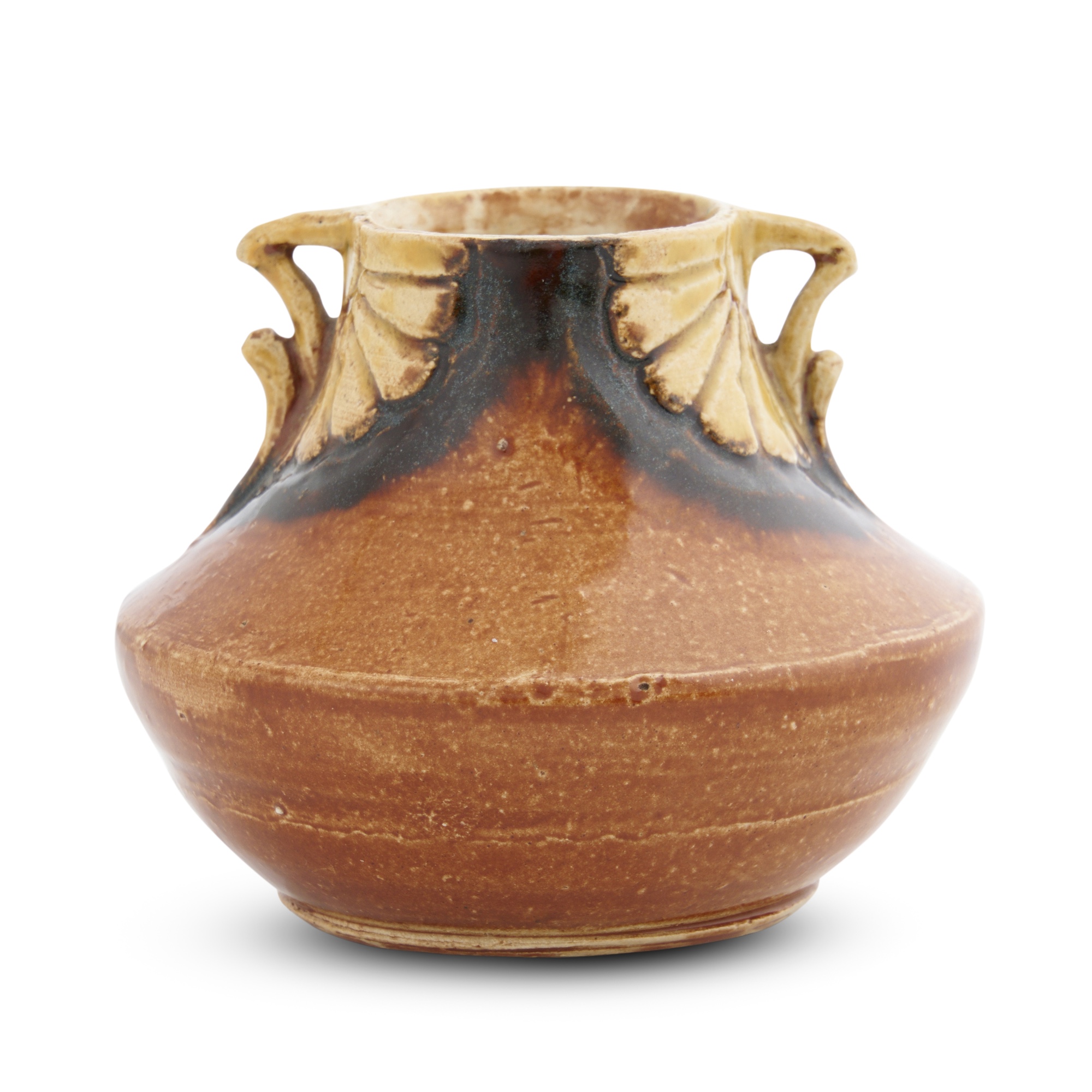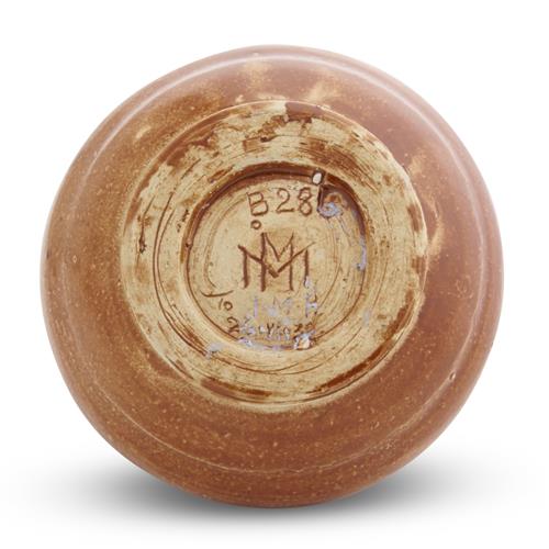Of compressed tapering shape, with two shaped handles, incised with stylized floral design to the neck, glazed in brown and cream tones, incised monogram and numbered 'B286' underside, together with an illegible inscription