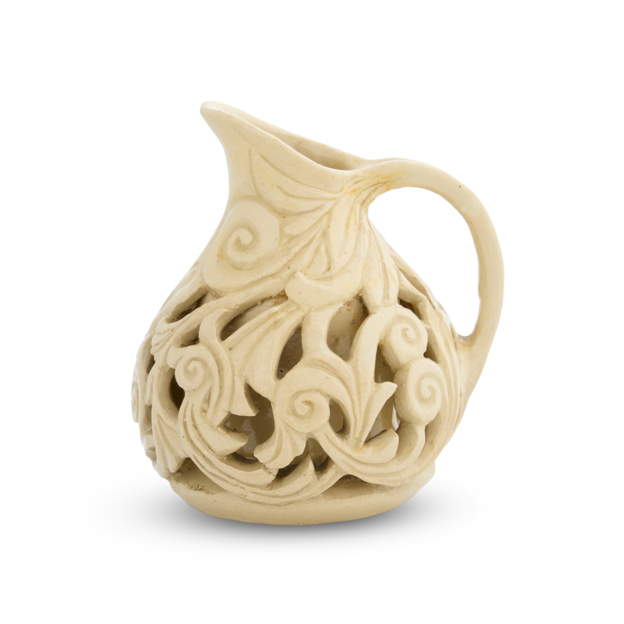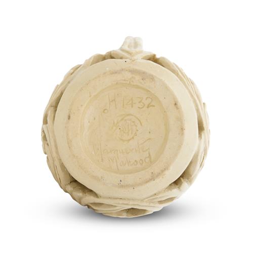 Baluster with a rounded handle, incised and pierced with a stylized scrollwork design, incised signature 'Marguerite Mahood', with monogram, numbered 'H1432' underside