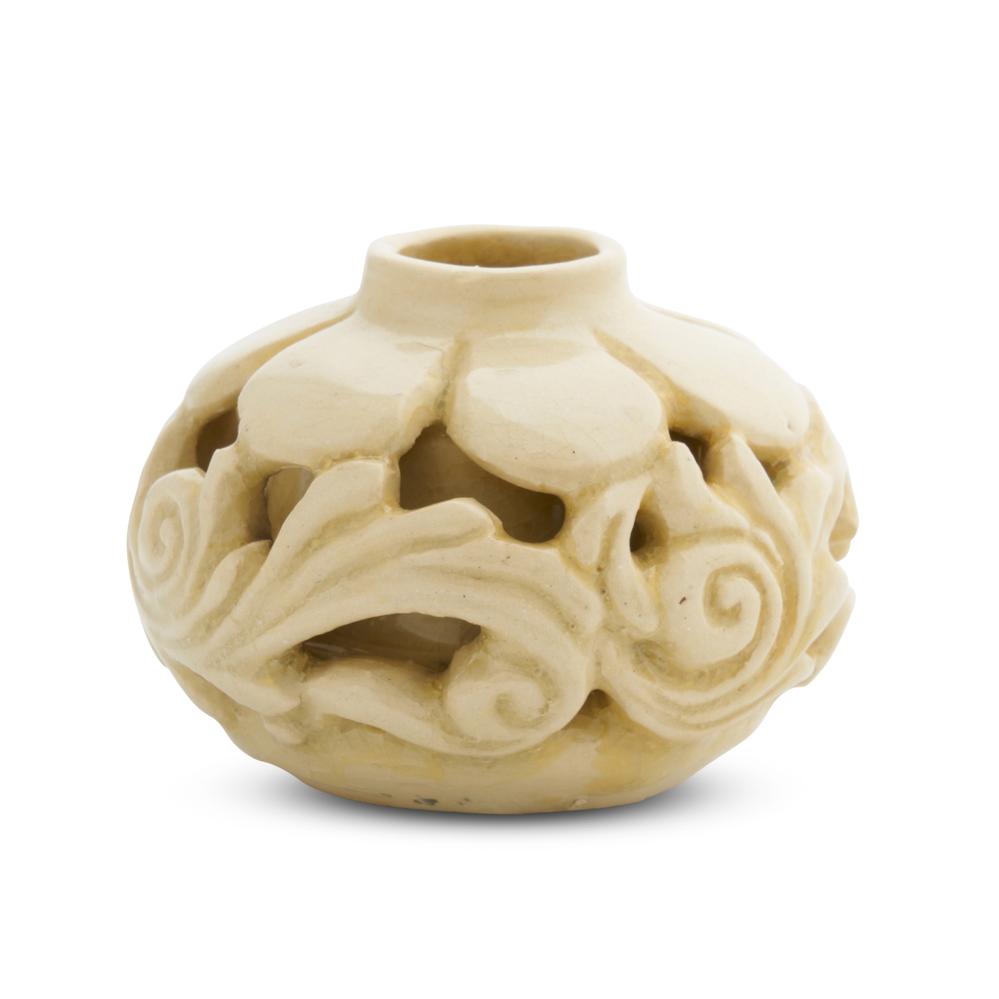 Of compressed circular form, incised and pierced with a stylized foliate and scrollwork design, incised signature 'MMahood' and numbered 'J1468' underside