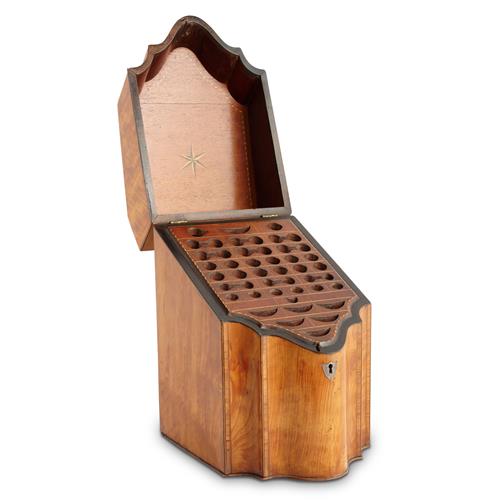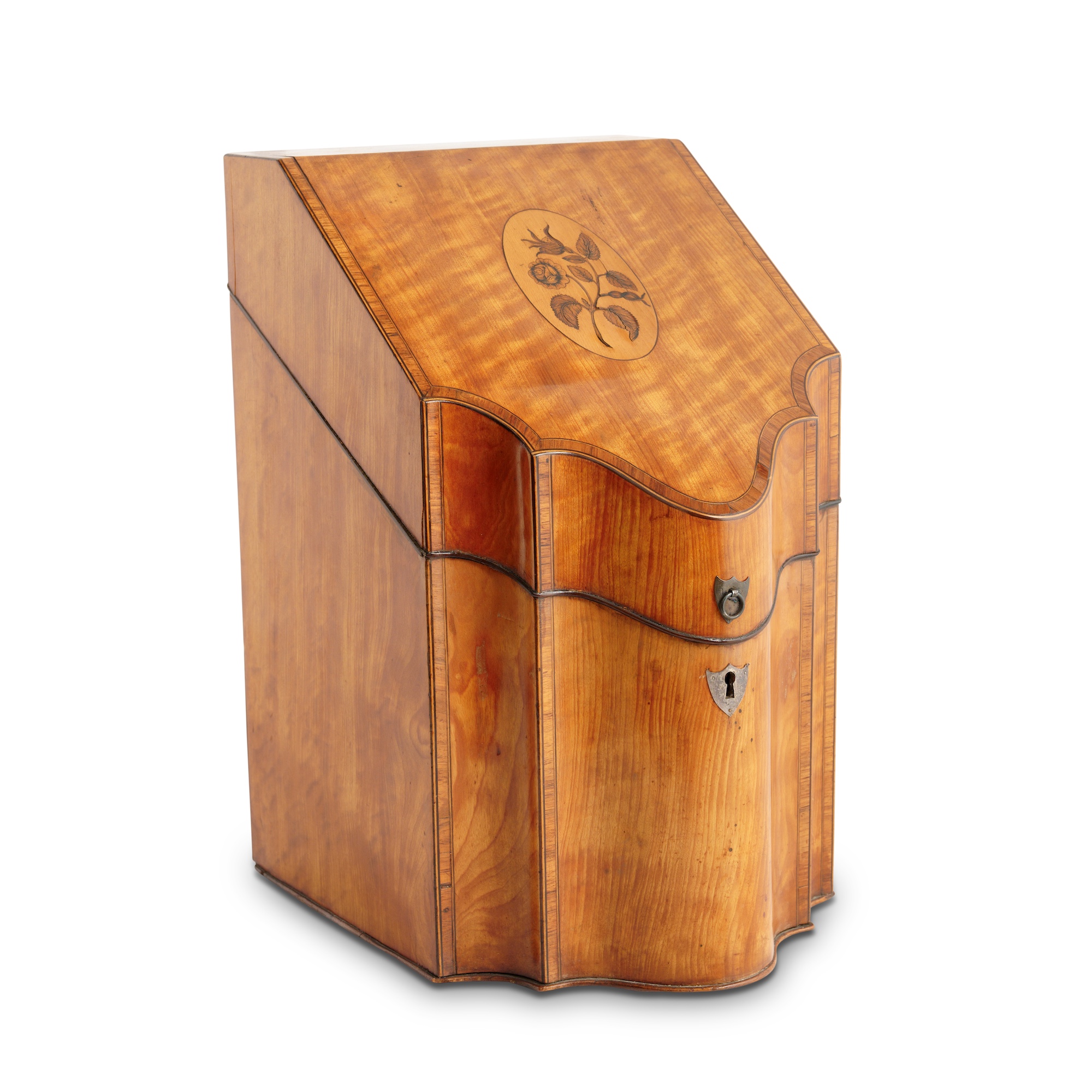 Of typical form with a sloping hinged cover and serpentine front with silver ring handle and escutcheon, the centre of the cover inlaid with a pen work rose within an oval reserve, the edges of the cover and front cross-banded in rosewood, the interior also decoratively inlaid and retaining its knife divider