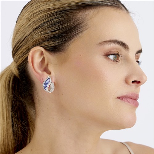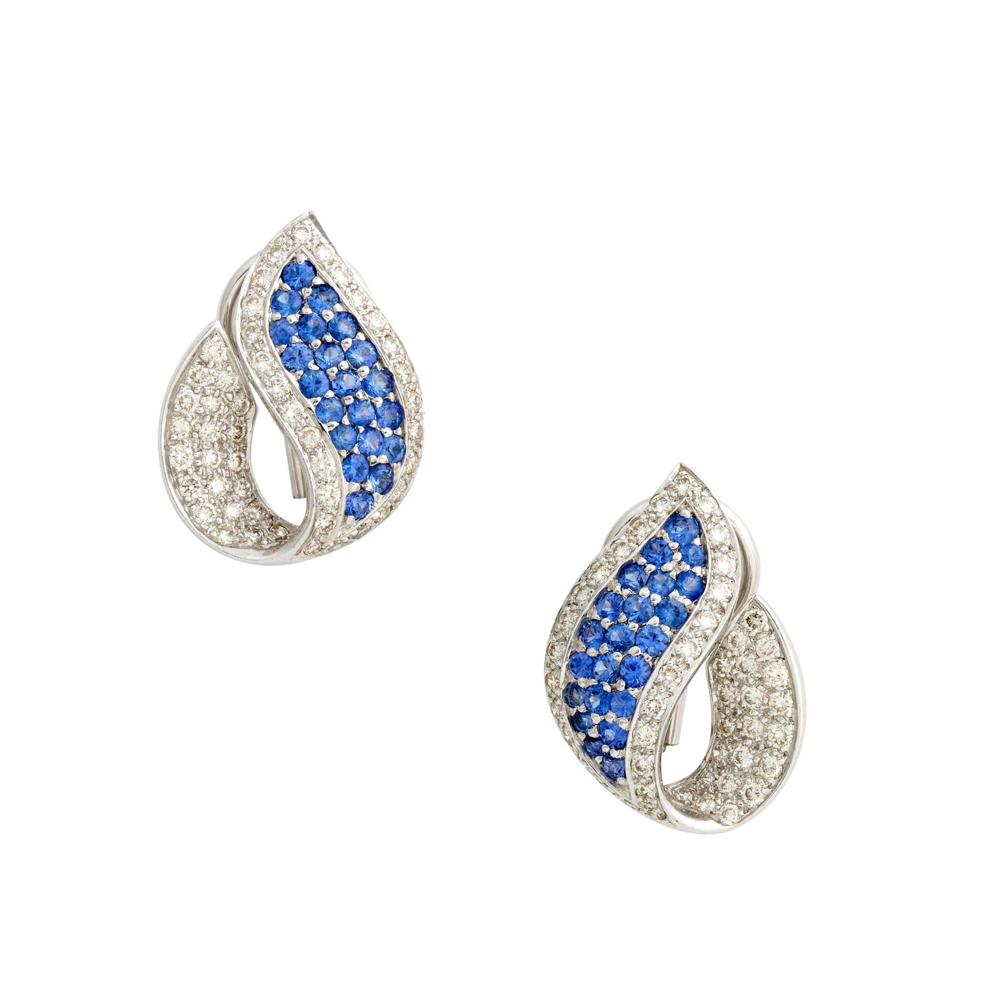 Each of foliate design, pavé-set to the centre with a cluster of claw-set sapphires and round brilliant-cut diamonds within a diamond set border, the diamonds together weighing approximately 1.59 carats to a post and european clip, length approximately 29mm, width approximately 20mm, gross weight approximately 13.4 grams.