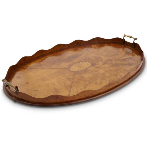 Oval with an undulating gallery and scrolling brass handles to the ends, inlaid with an oval patera centre and stringing dividing the tray into quarters, the edges cross-banded